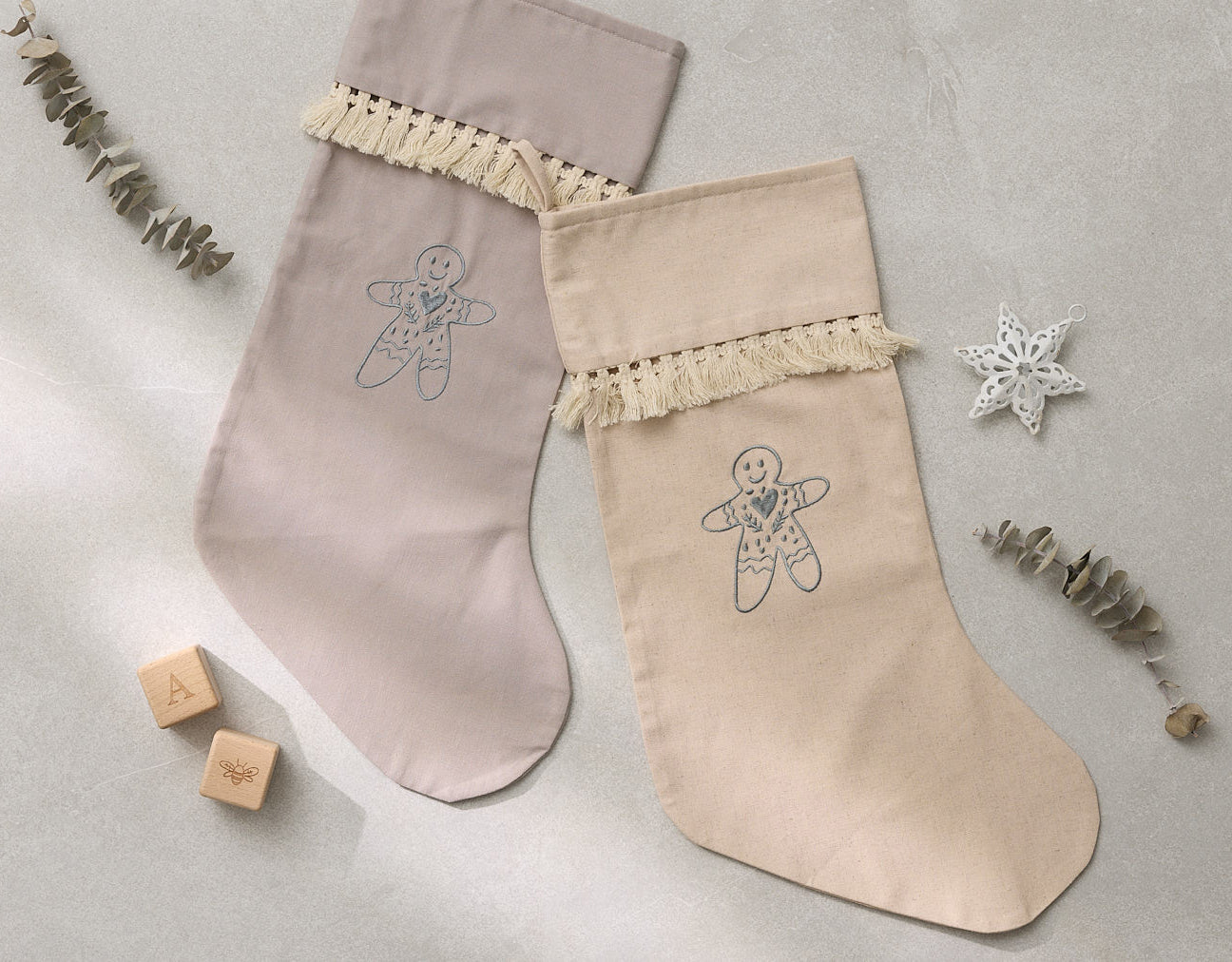 Made from a Linen/Cotton blend with our signature boho tassel fringe, and embroidered with the cutest gingerbread man!