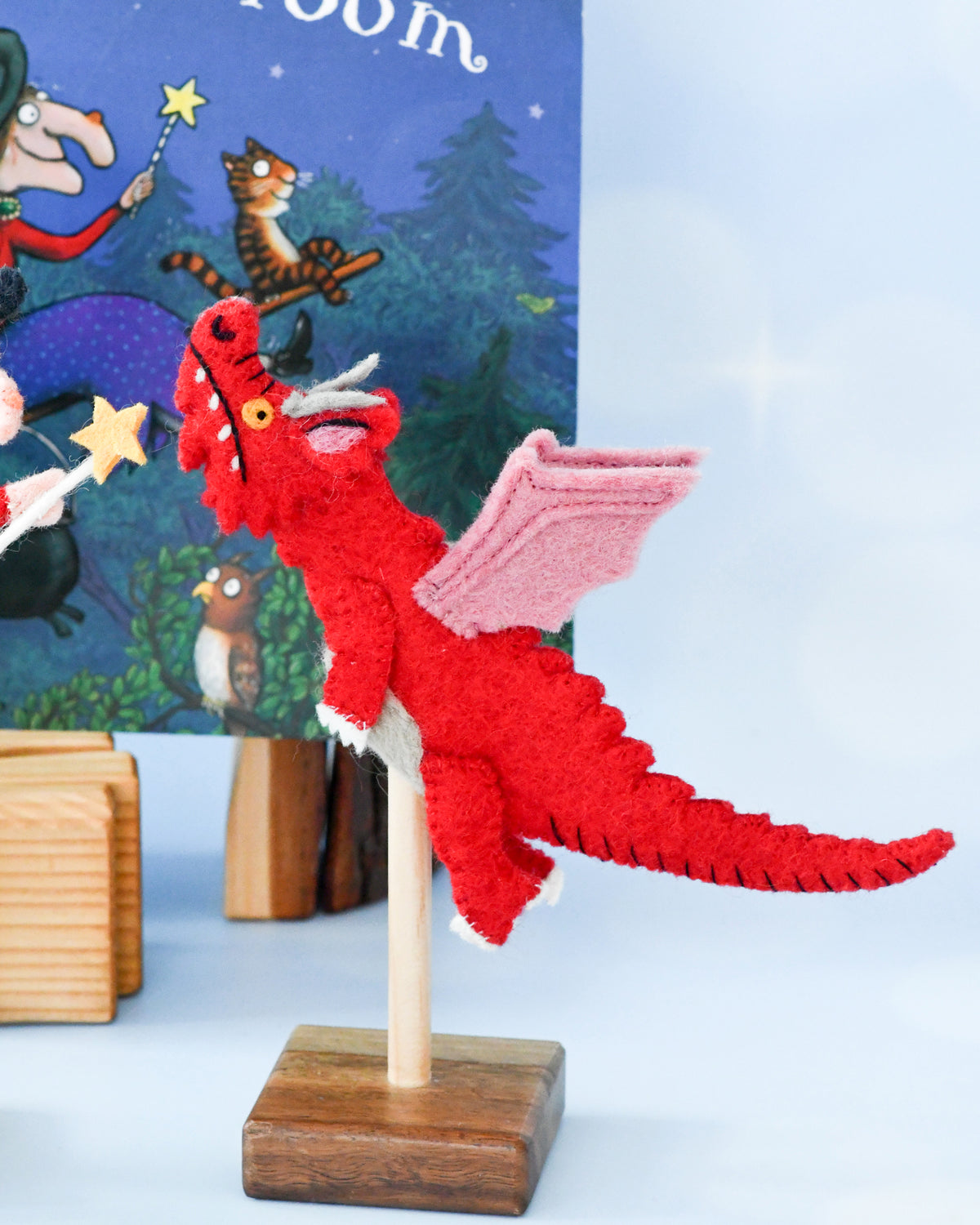 Fly through the wind and bring the spellbinding story of Room on the Broom to life with our officially licensed Finger Puppets Set. Created in collaboration with Magic Light Pictures, this delightful play set features all the iconic characters from Julia Donaldson and Axel Scheffler’s cherished tale: the Witch, Cat, Dog, Bird, Frog and the fearsome Dragon. Each puppet is lovingly handmade from natural wool felt.