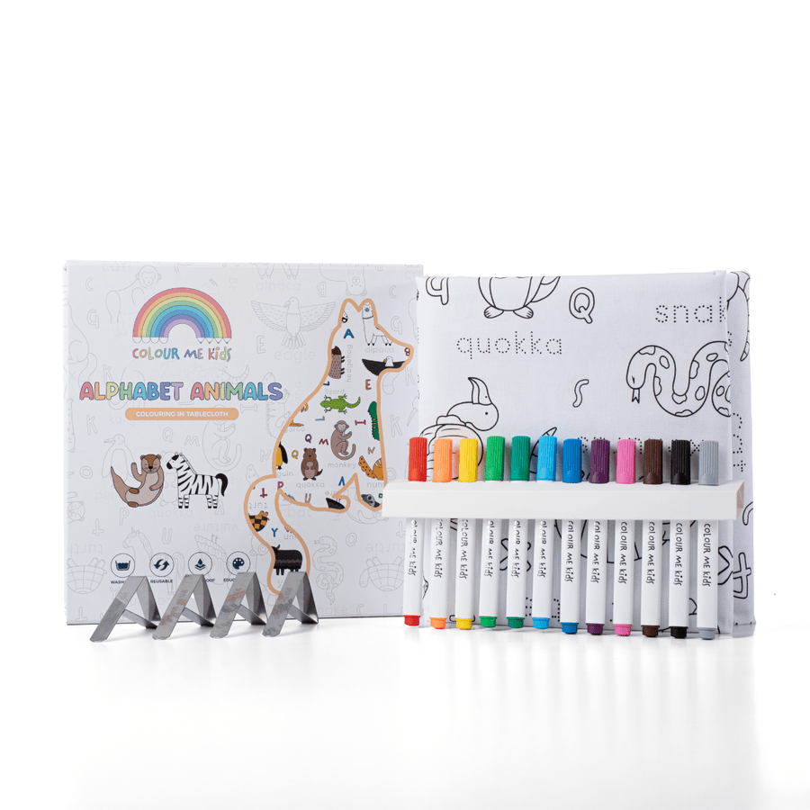 With 5 gorgeous prints to choose from, each kit comes with 12 ultra-washable, non-toxic markers and 4 tablecloth clips to hold the cloth in place while colouring - all packed into a beautiful box, ready for gifting.