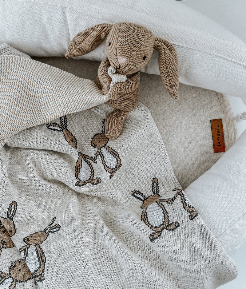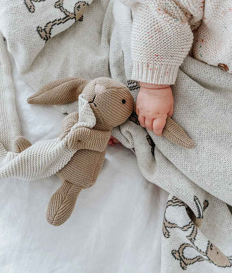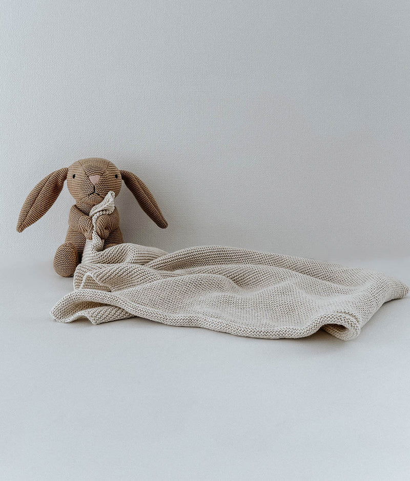 Our classic Bunny Snuggly in Khaki Brown & Natural, a soft cotton comforter designed to be held, loved, and taken everywhere with your little one. Featuring a gentle khaki bunny with a sweet pink nose and a natural marle cuddle cloth, this Snuggly is crafted to feel familiar, calming, and reassuring from the very first cuddle.
