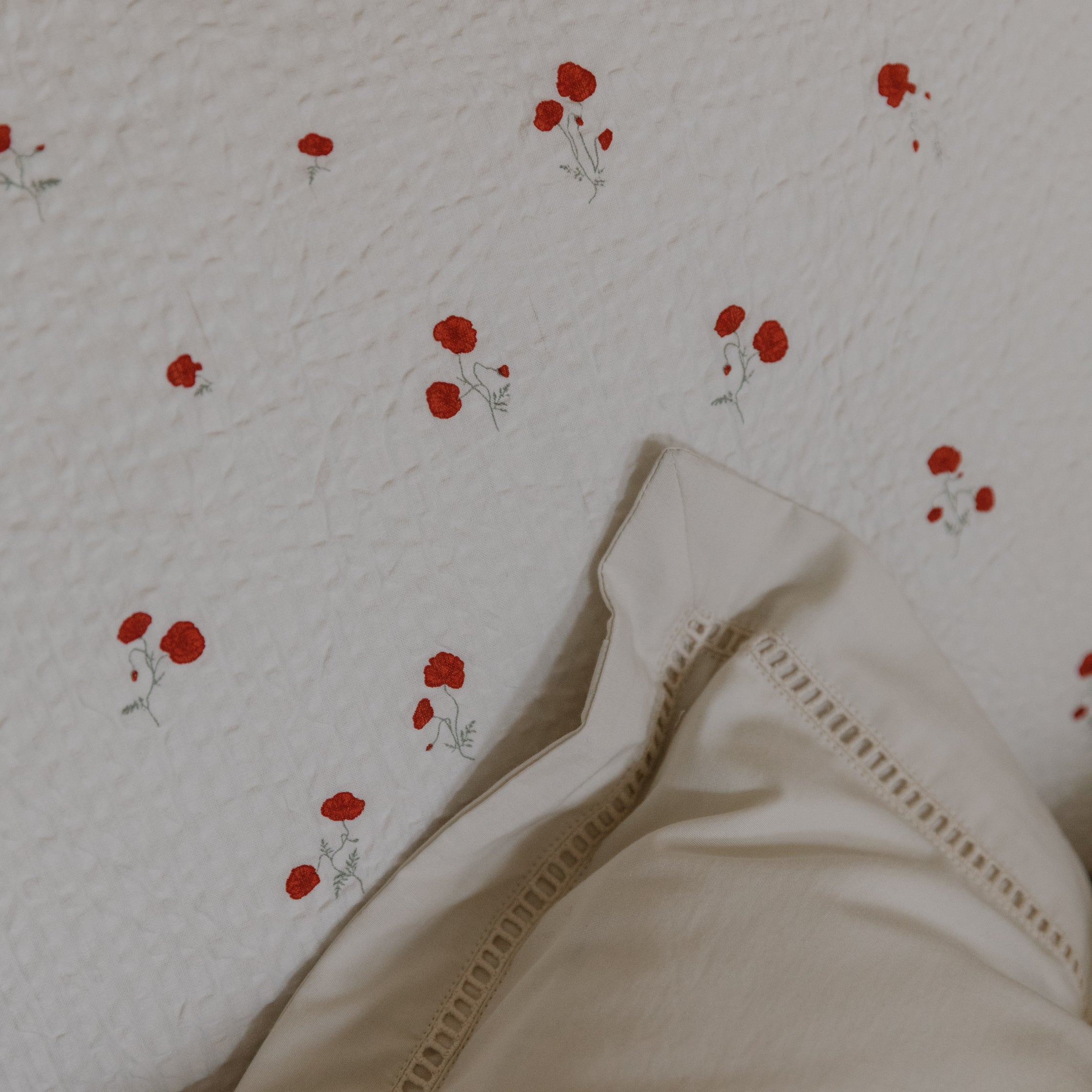 Our bedding is the core of what makes Garbo&Friends, designed for the sweetest of dreams and adorned with our signature patterns. This bedset is simple in its design with a clean button closure that lets the material speak for itself. Made from beautifully textured and soft organic cotton seersucker that adds an extra dimension to the simplistic Poppy print.