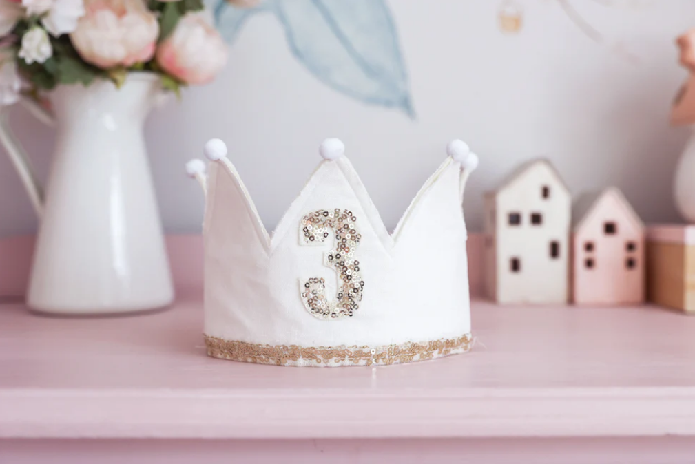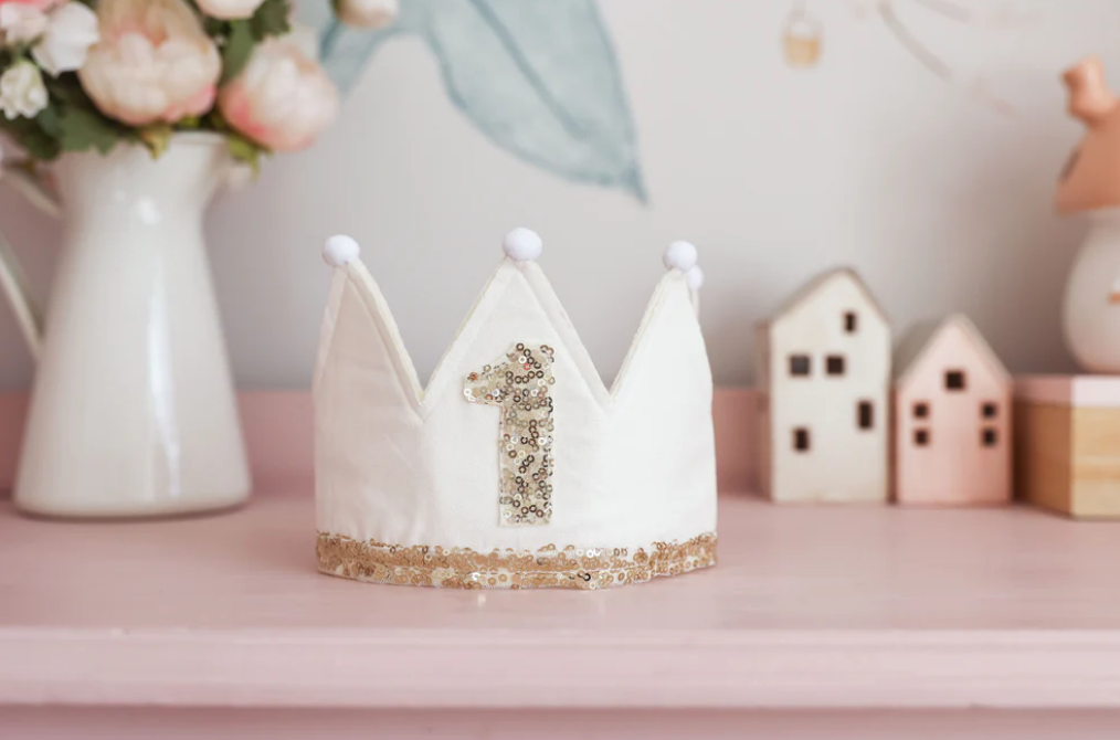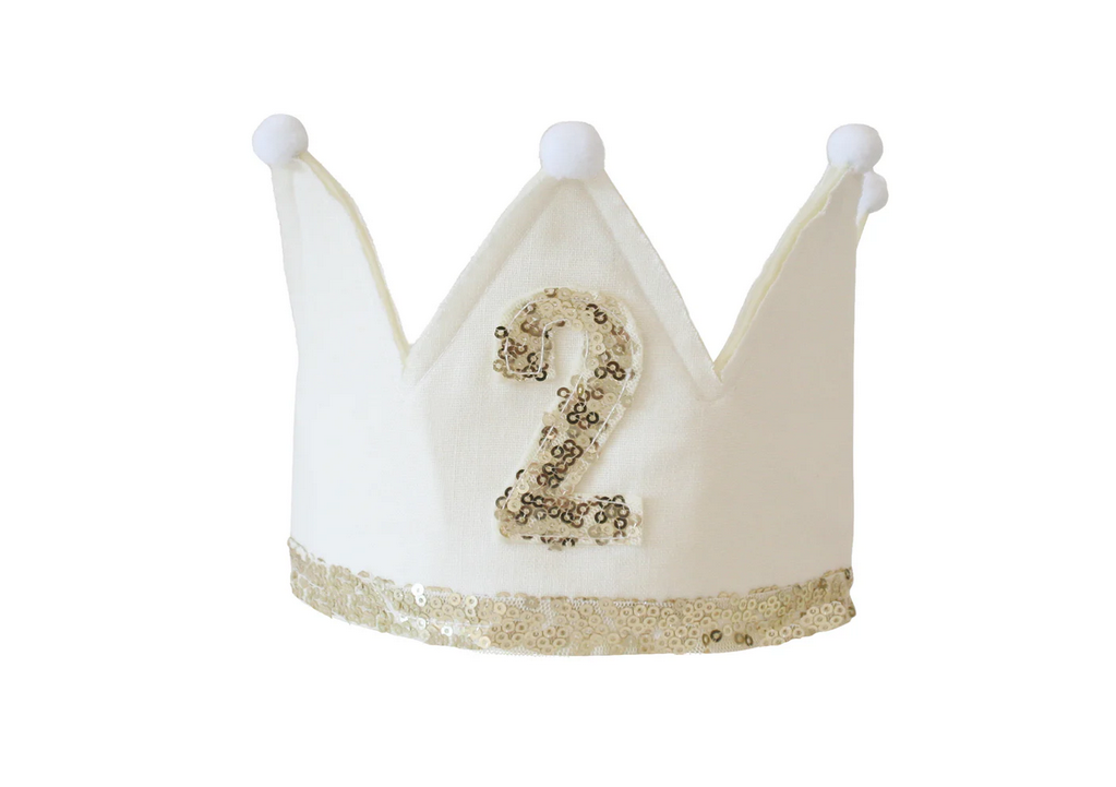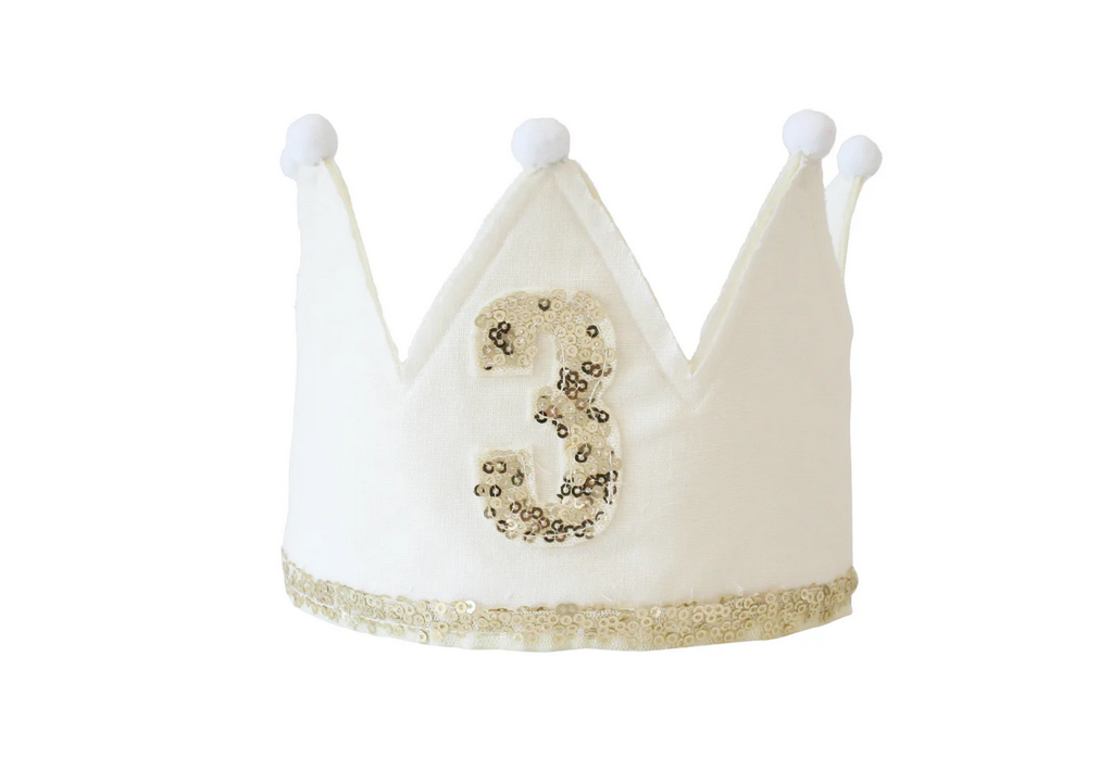 A birthday WHITE linen and gold adjustable crown for your precious little one to celebrate. Bright sequins and felt with linen backing. Ribbon ties.