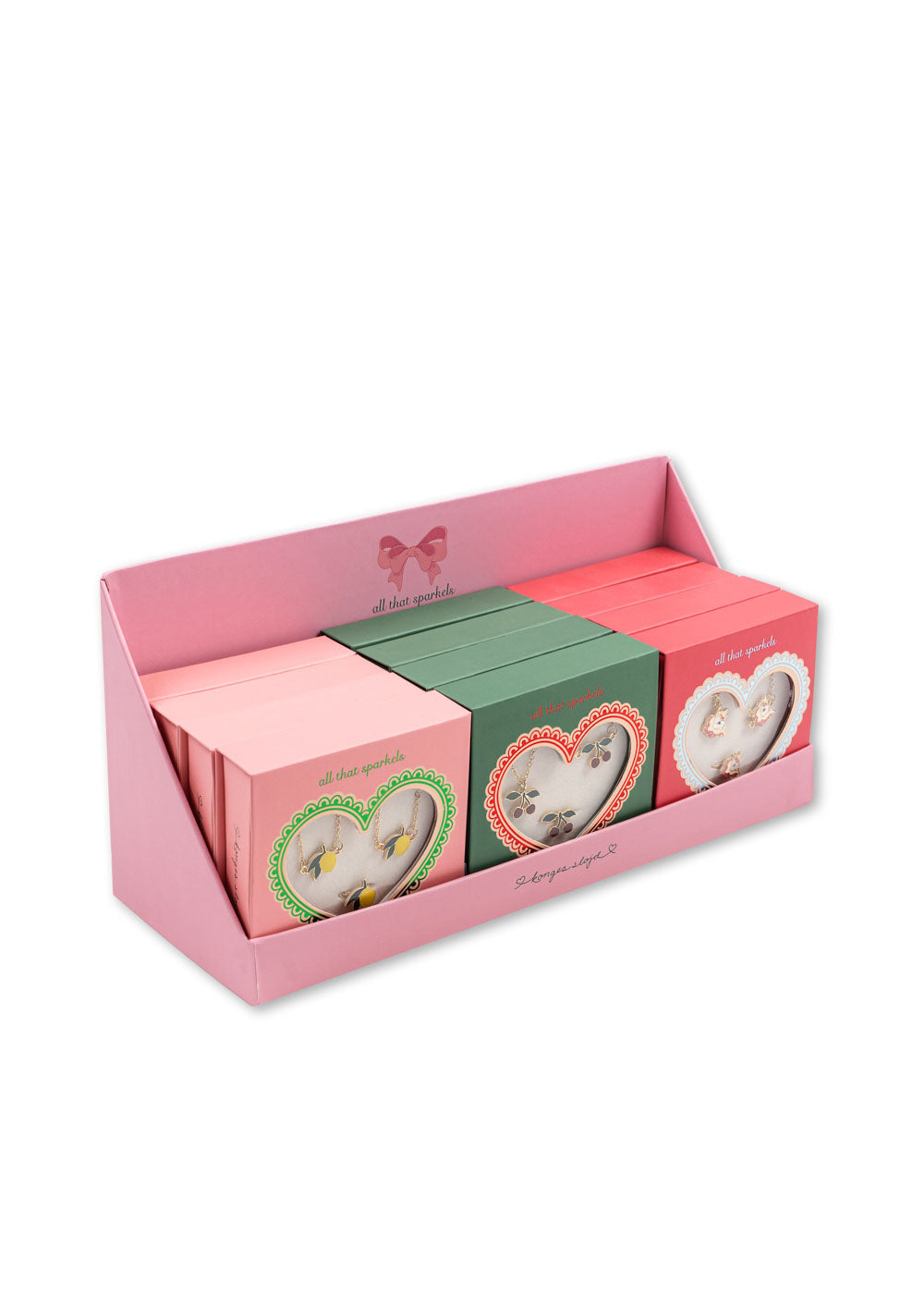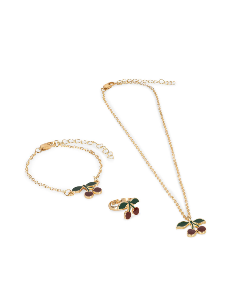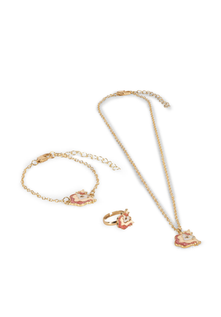 Gift box containing a necklace, a bracelet and an adjustable fingerring.