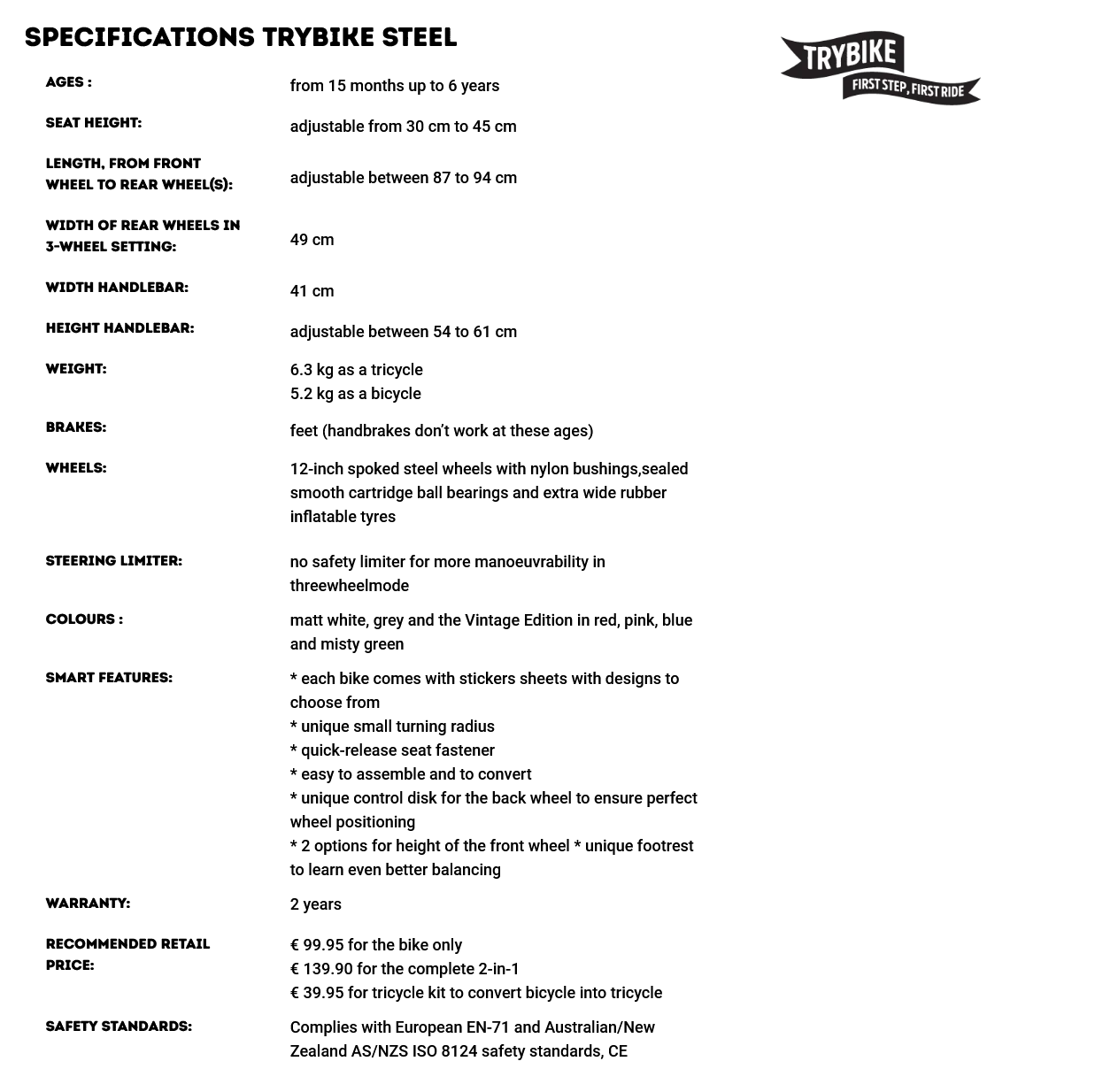 The Trybike has been designed and developed in The Netherlands by Co&Co after many years of experience with balance bikes. We have applied our experience and selected the best materials, created the most durable construction and added the nicest details as well as a quality finish.