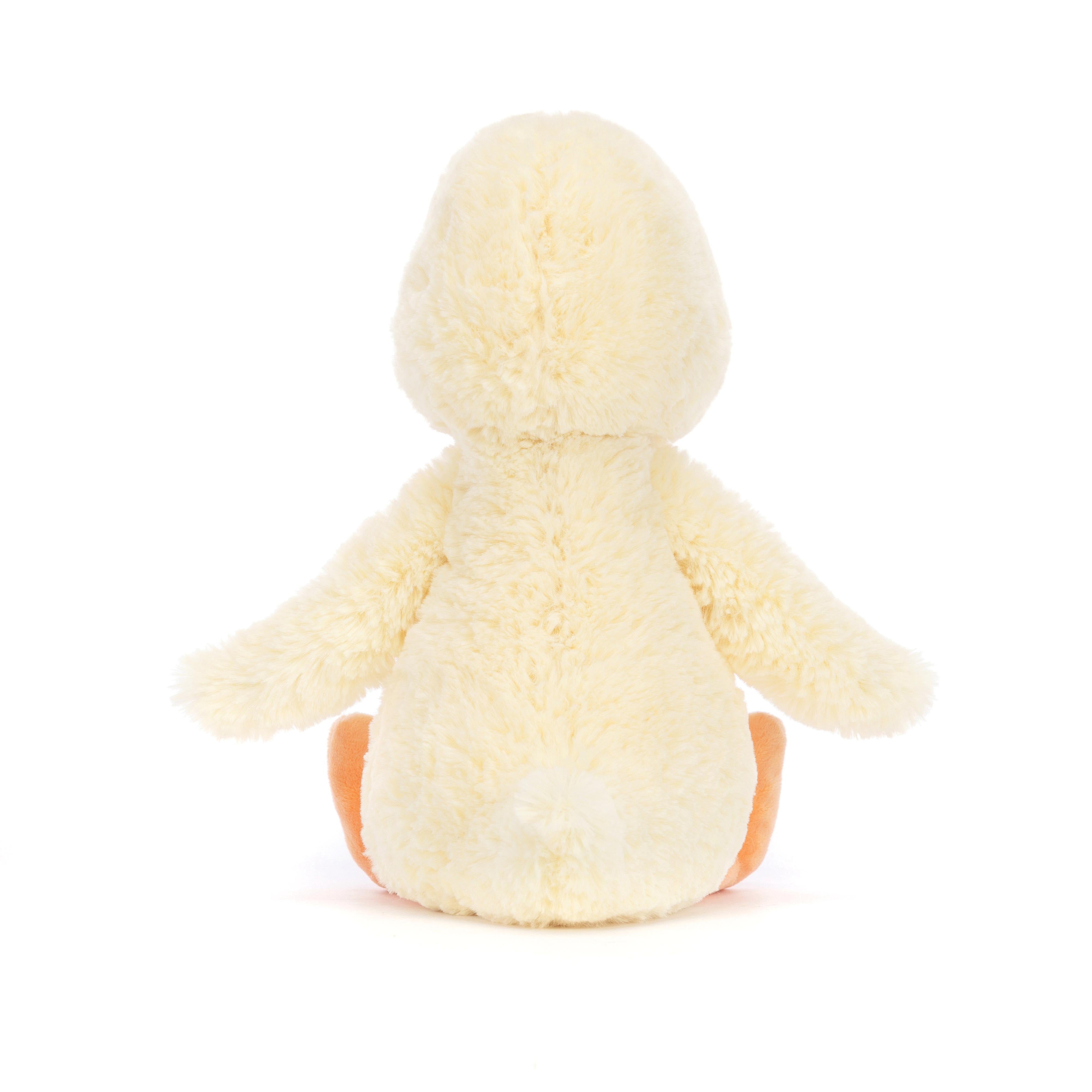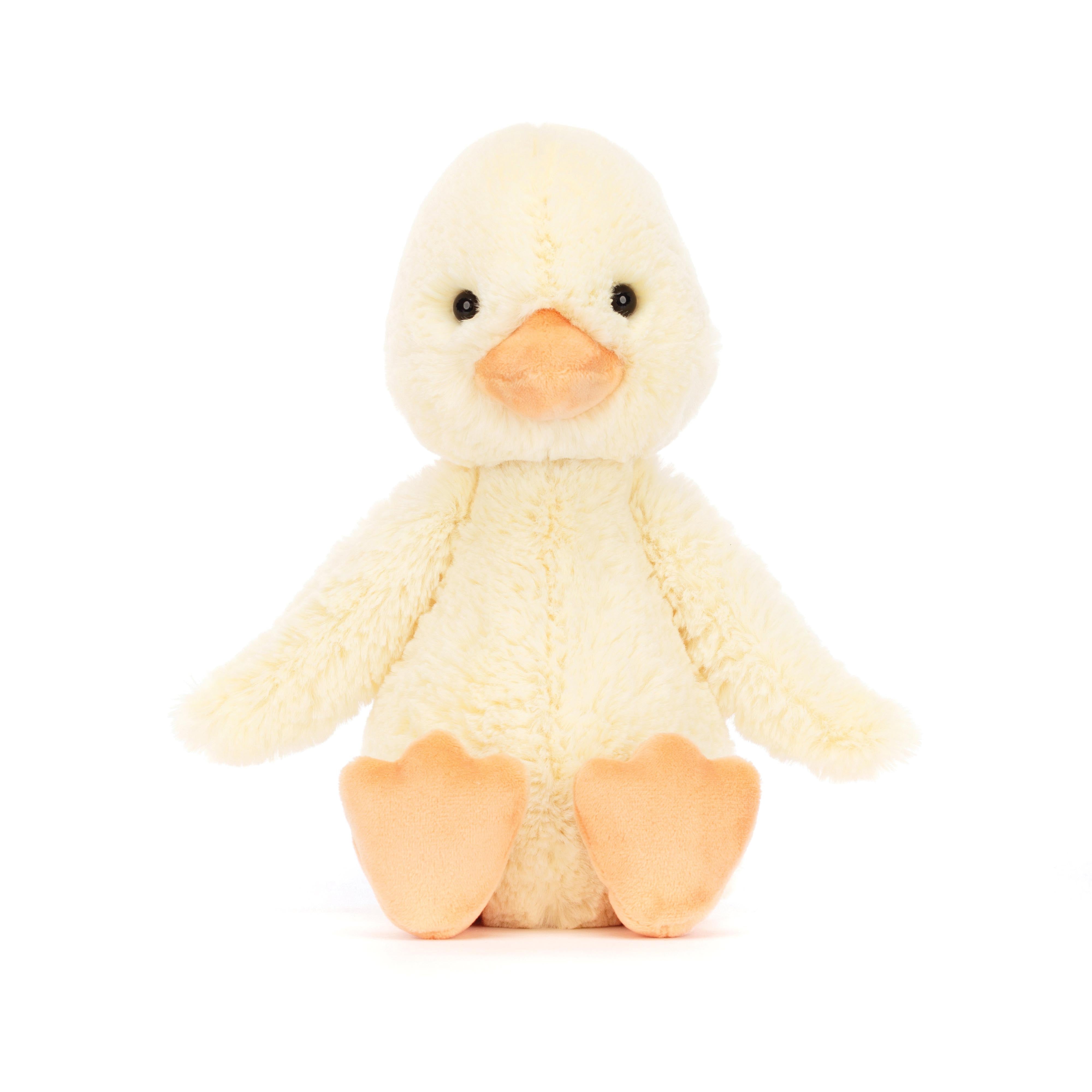 Bashful Duckling is soft and gentle in cosy primrose fur. This cheery hatchling has orange feet and bill, a perky tail, and cuddly wings. With shiny eyes and a curious face, our duckling is ready to waddle your way.
