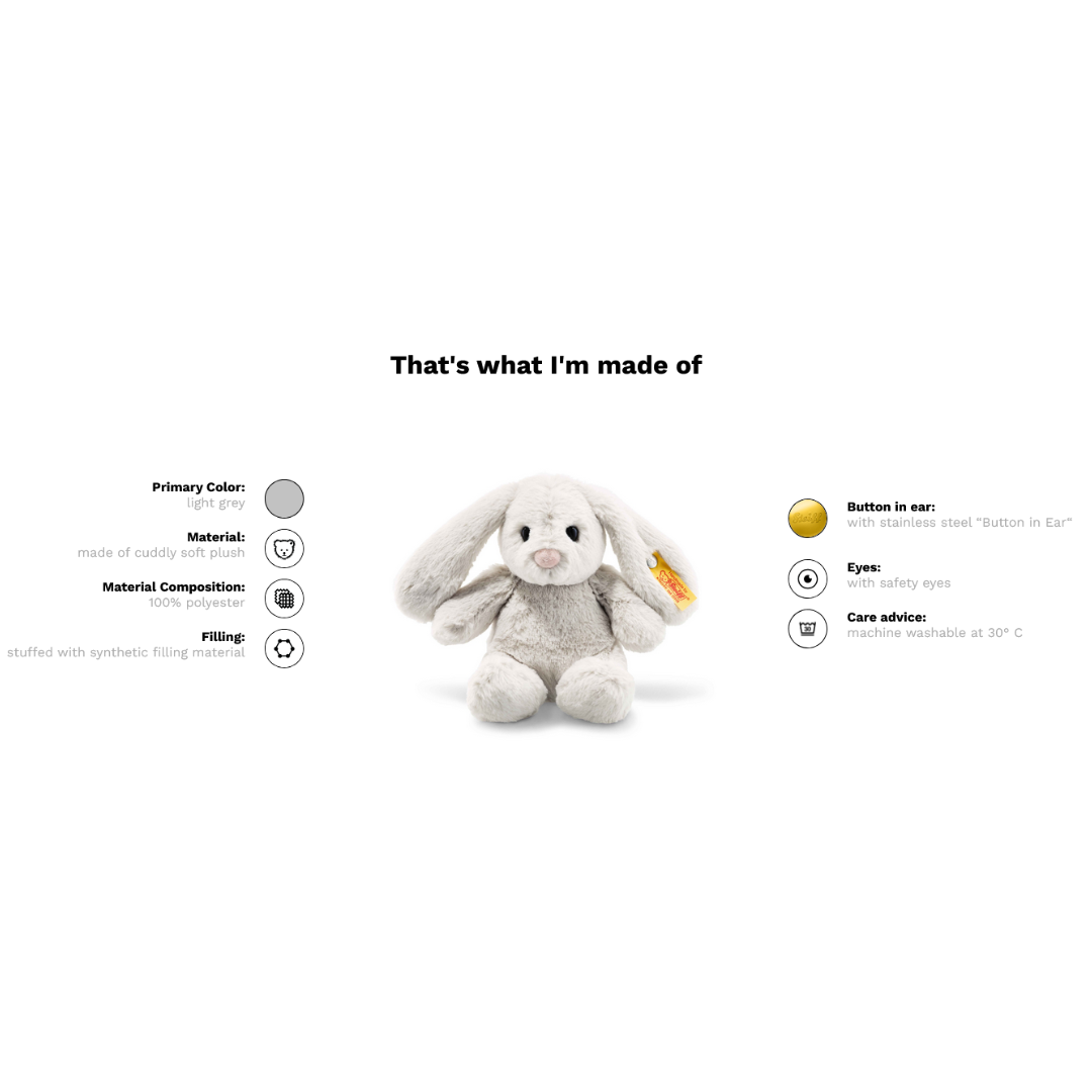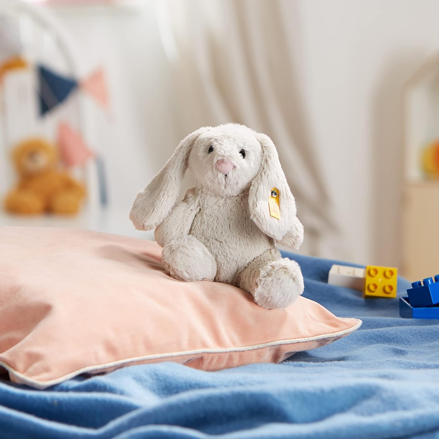 Children's eyes light up when Soft Cuddly Friends Hoppie rabbit comes hopping. Her cute pink nose and super long ears make her the perfect affectionate companion for young and old alike. The bean bags included at her seat, paws and soles ensure good support and are ideal for gripping and feeling. The soft and dense cuddly toy in tender light grey lends itself to snuggling and caressing.