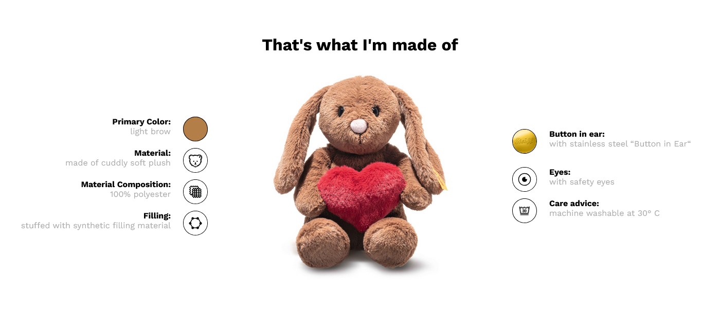 Sometimes it’s the smallest gestures that tell the most touching stories: Hoppie rabbit holds her red heart close and smiles with quiet warmth. Made from exceptionally soft plush, she sits upright thanks to a little bean bag sewn into her bottom. Measuring 16 cm and wearing the iconic Steiff “Button in Ear”, Hoppie is a gentle cuddle companion who offers comfort and stands by your side through every adventure.
