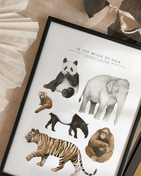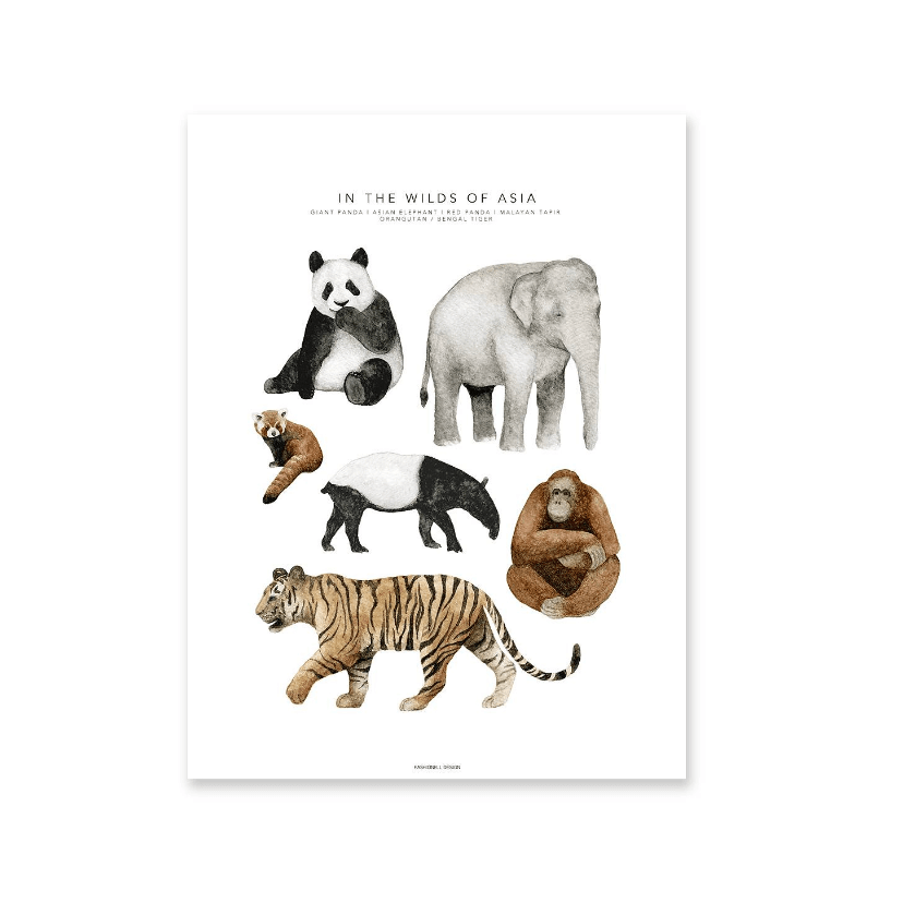 In the wilds of asia or In Asia is a poster for the children's room with classic animals in Asia, painted in watercolor. Perfect for the animal lover.
