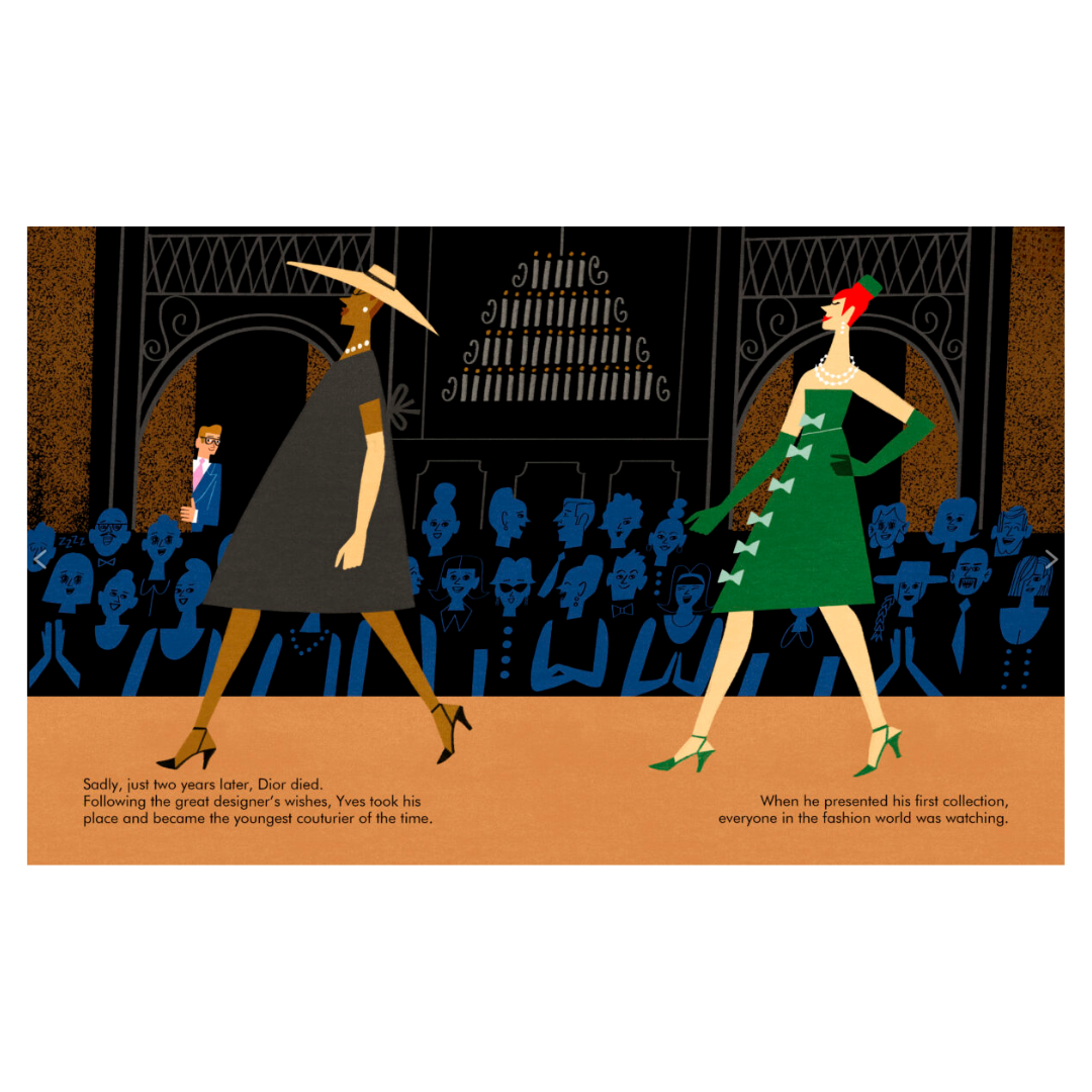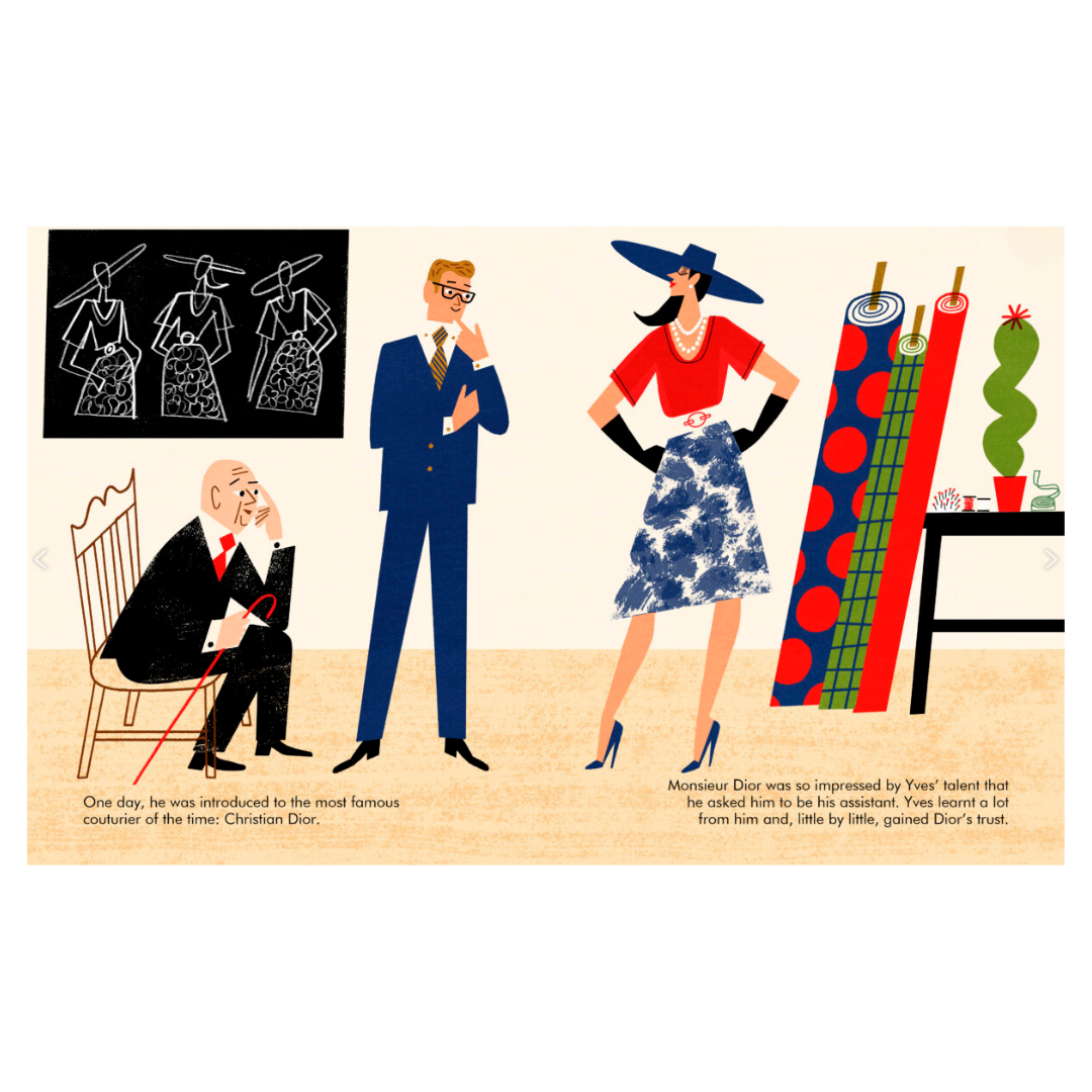 At eighteen, his hard work paid off when he was invited to join a top fashion school in Paris, and after even more hard work, Yves was invited to join the famous fashion house Dior, where he became their lead designer! Later, with the support of his lifelong partner Pierre, Yves started his own fashion house. His bold and stylish designs - like tuxedo suits and pea coats - revolutionised women's clothing and continue to influence fashion today.