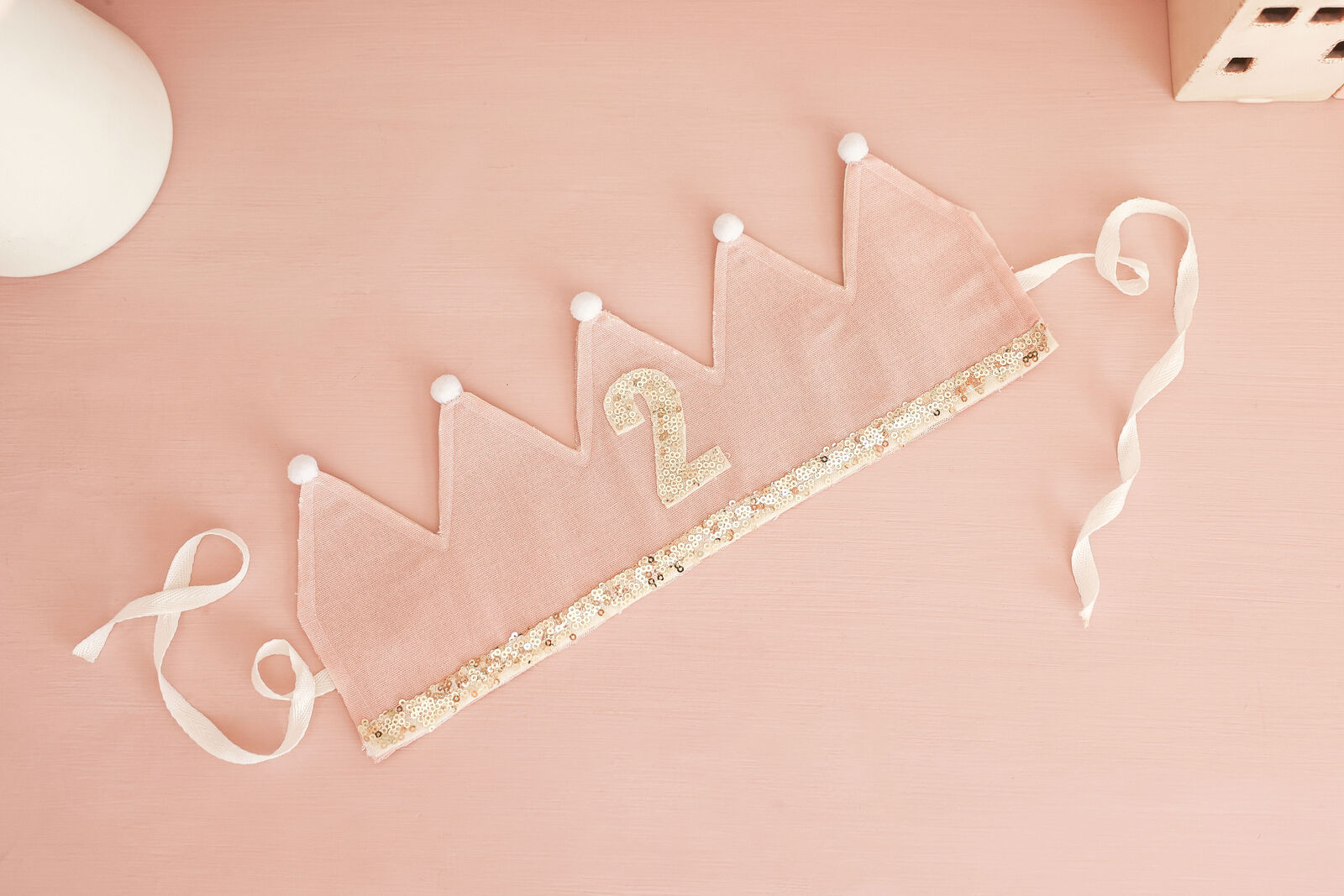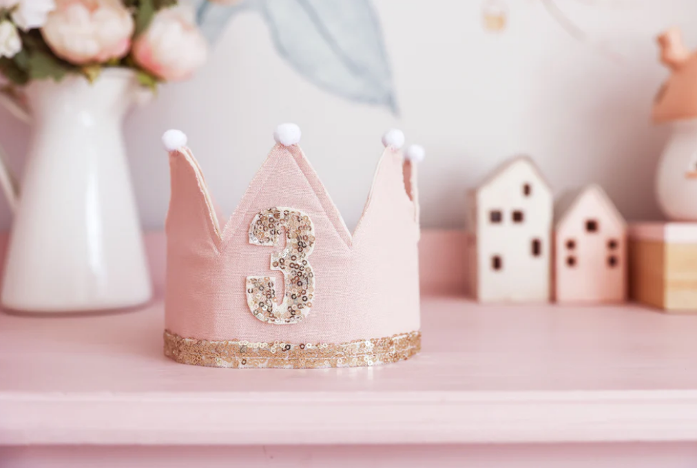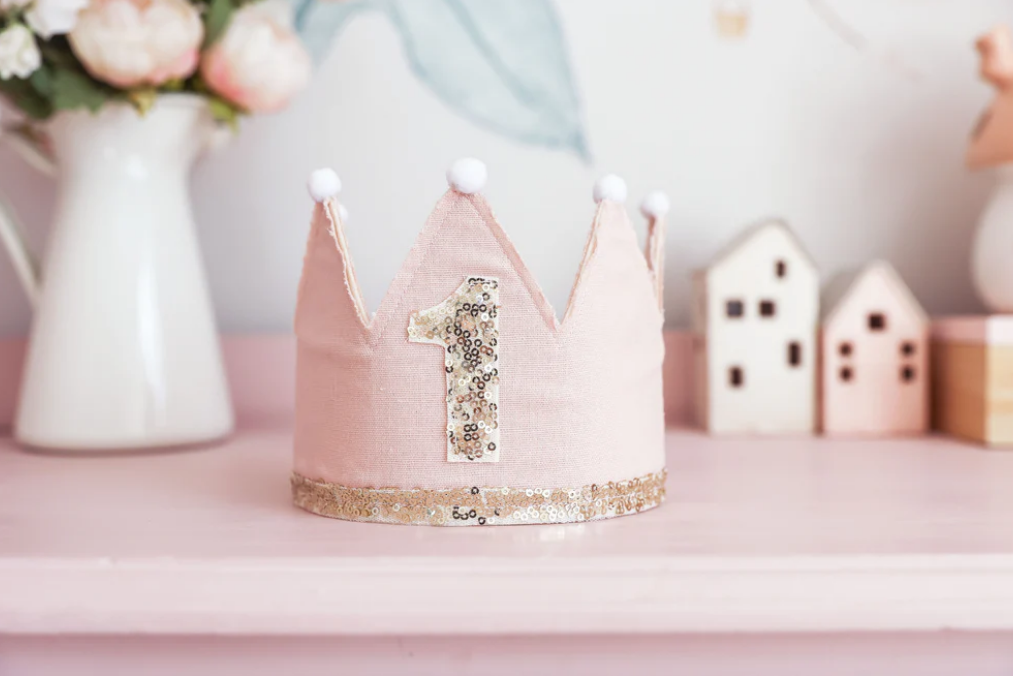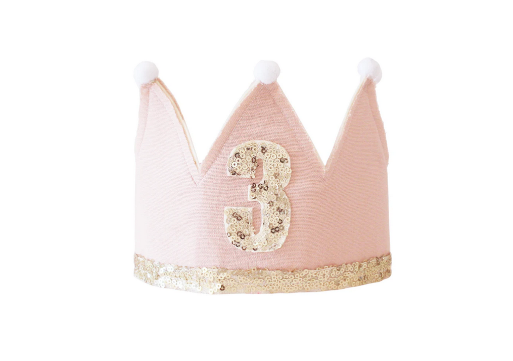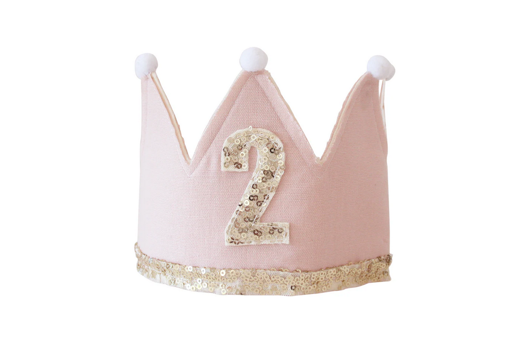 A birthday pink linen and gold adjustable crown for your precious little one to celebrate. Bright sequins and felt with linen backing. Ribbon ties.