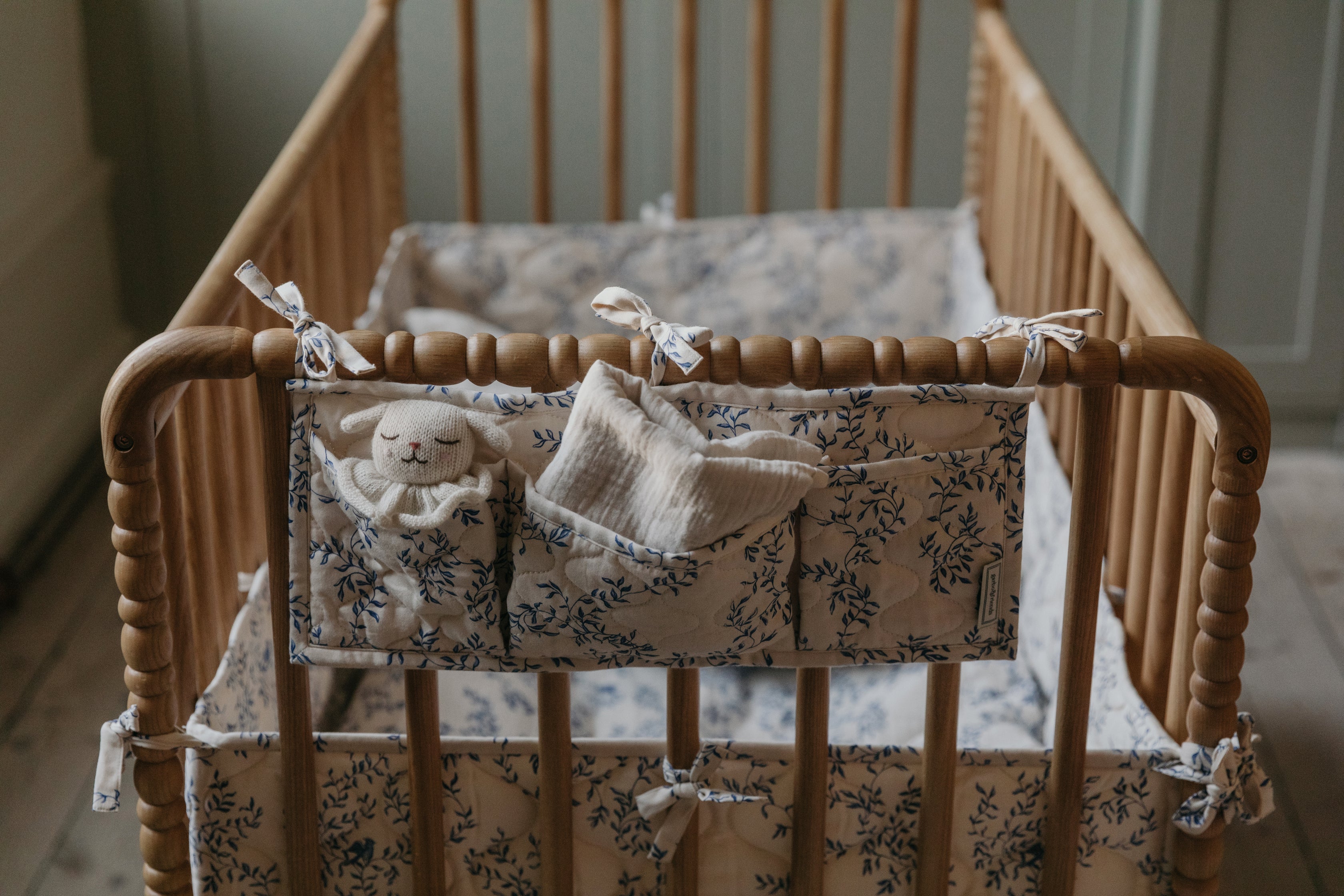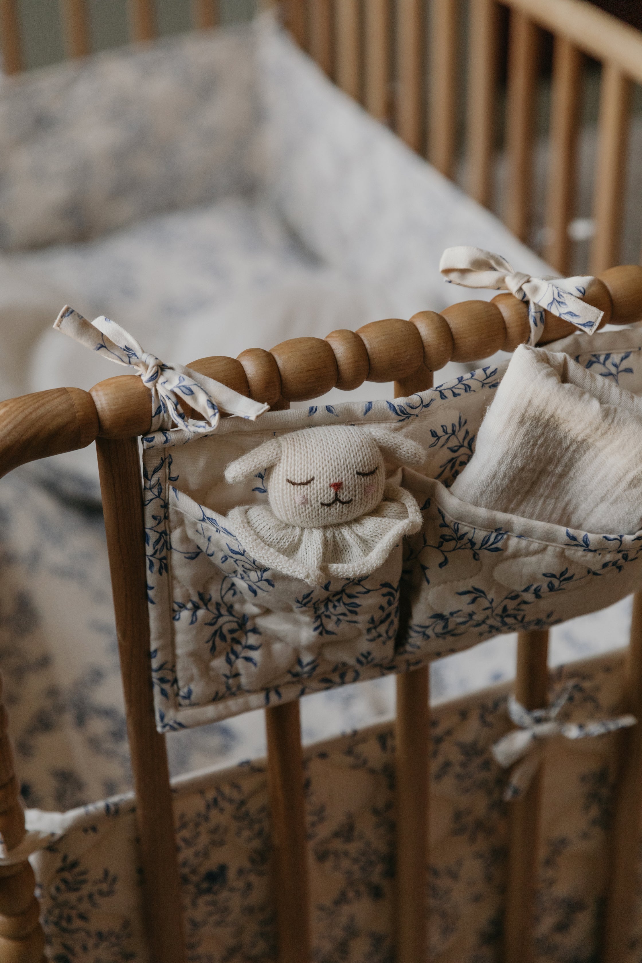 Quilted bed pocket with three sections made from organic cotton satin. Perfect for hanging on the side of the crib to ensure that smaller necessities such as pacifiers, rattles and bibs are always within reach.