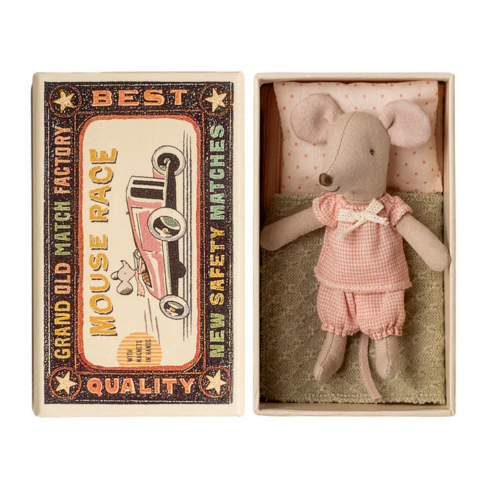 A classic Maileg item, this mouse is ready for hours of play and sleeps soundly in its little matchbox. The clothes and bedding are made of soft fabrics with unique prints in beautiful colors. The mouse has magnets in its hands.