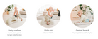 The plate, which can be turned without tools, offers two different sides. On one side, gliding pads provide stability, which is particularly important for the first attempts at standing up. Balance can be encouraged in a playful way. When the plate is turned, it is equipped with low-noise castors on the other side, which allow it to roll smoothly on a flat surface. Thanks to the rubber coating, they also leave no marks on the floor.