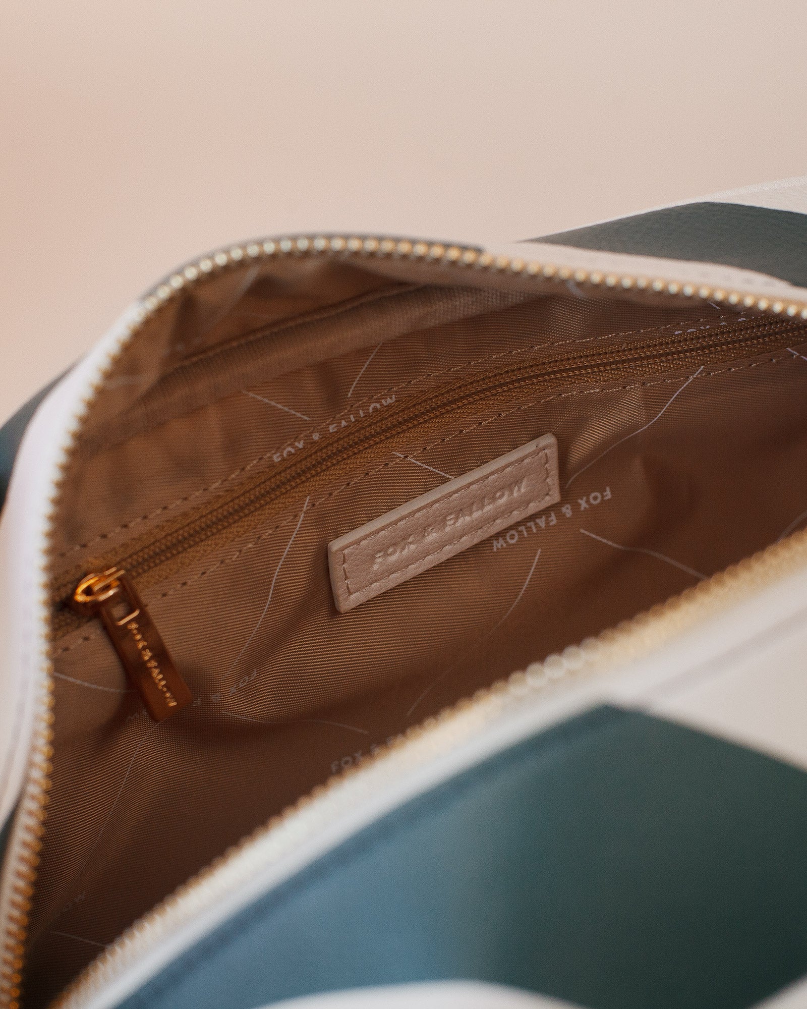 Crafted from super soft, yet durable luxury pebble vegan leather it's easy to keep clean - simply wipe down with a damp cloth. The monogrammed tan lining is designed to hide make up or spills but also makes it easy to find all your things.