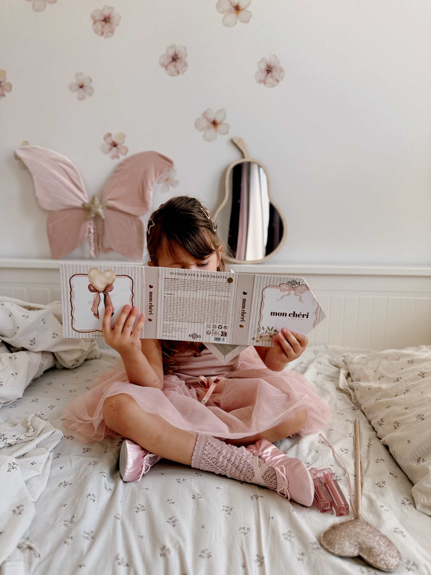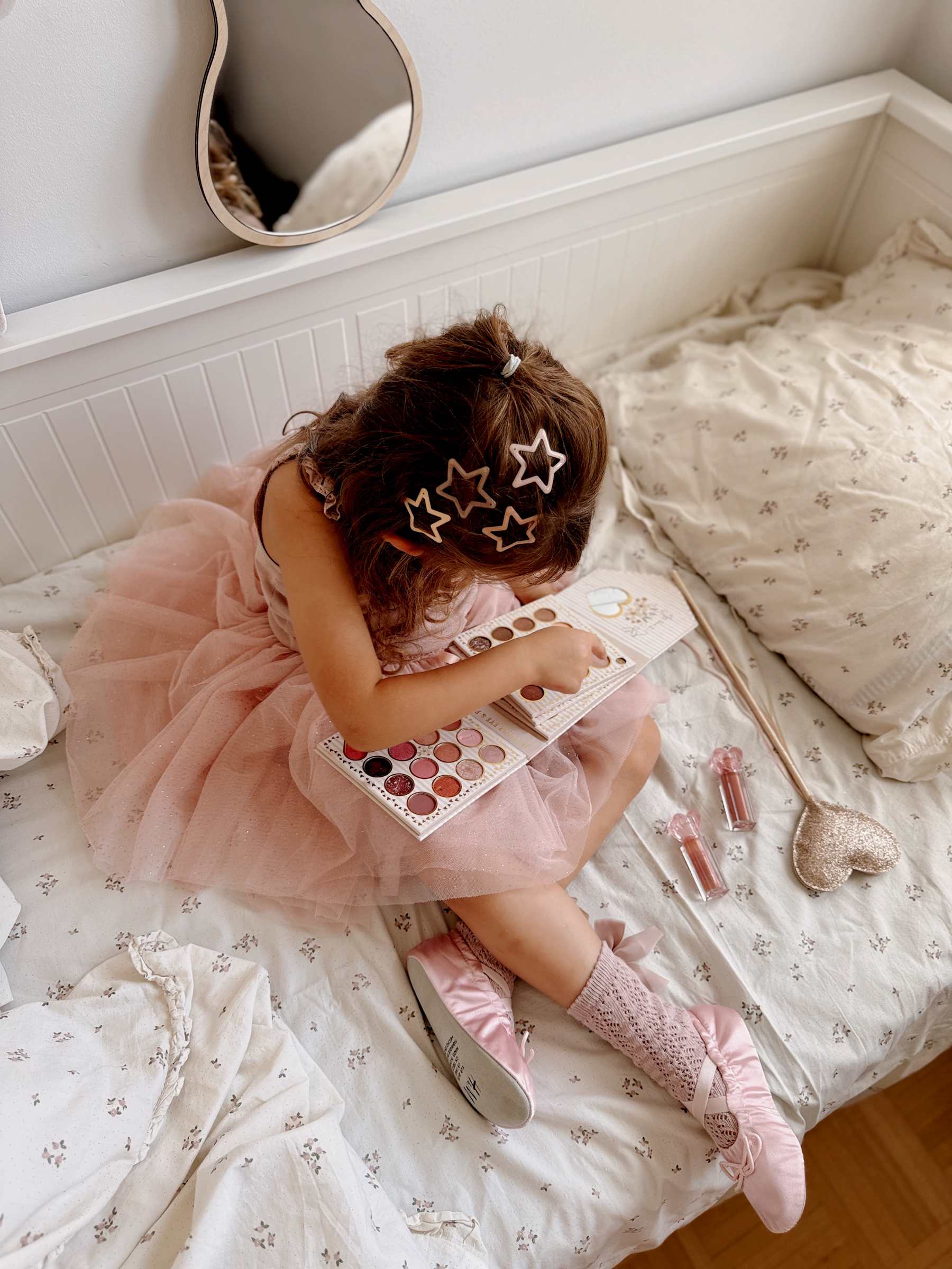 The compact case includes a built-in mirror and a mini eyeshadow brush for easy, mess-free application. Lightweight and travel-friendly, it’s perfect for dress-up, playdates, or little moments of glam