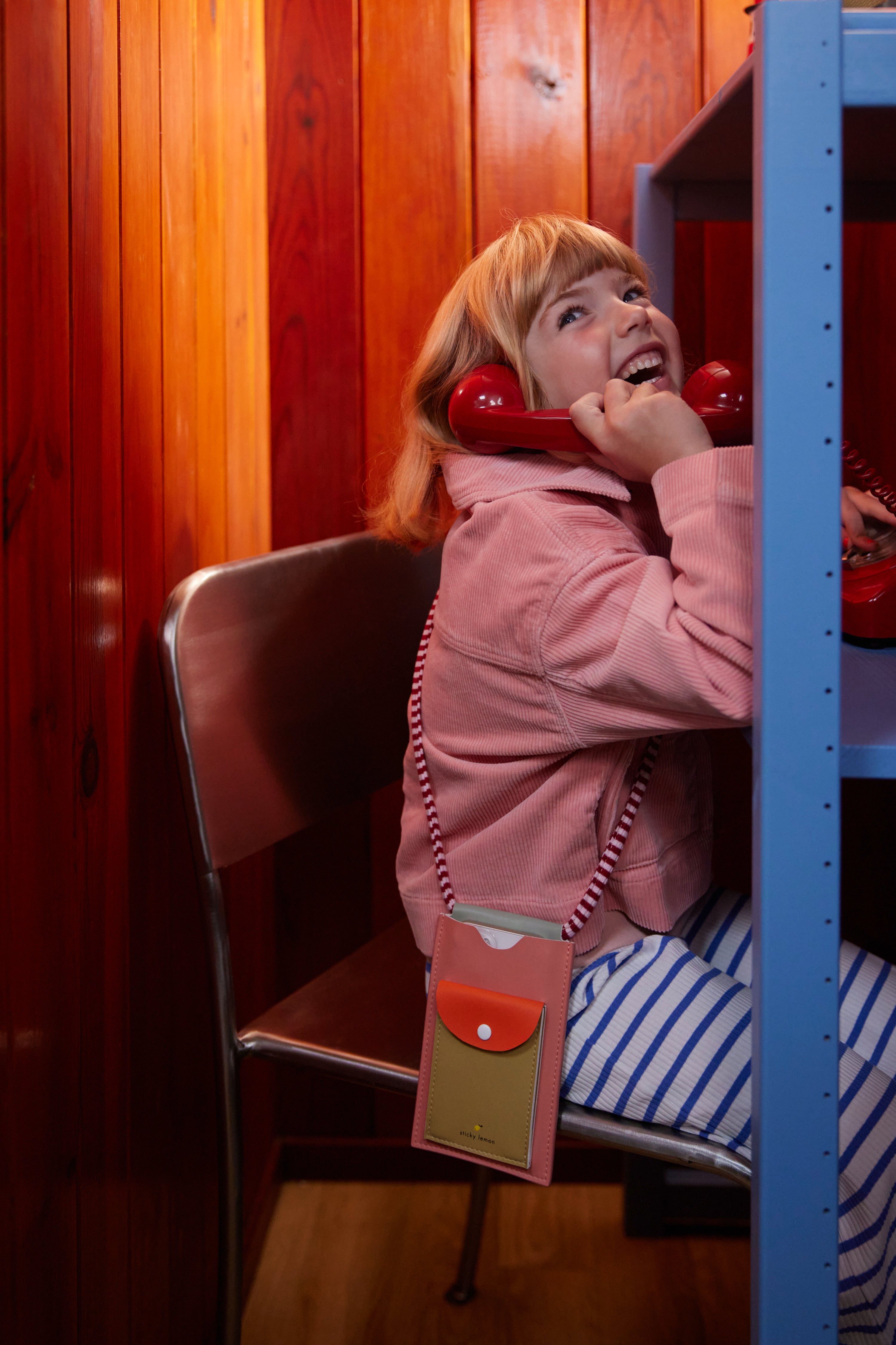 The phone pouch closes with a magnet, has space for three cards in the back and a small pocket on the front with a button.