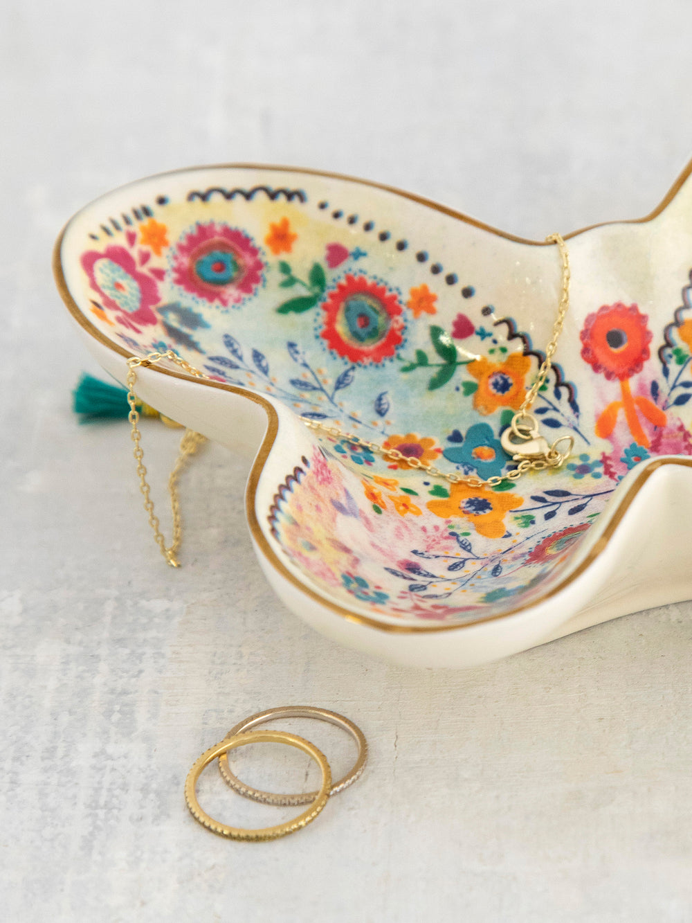- • Shaped colorful hand-molded trinket bowl feature a gold-rimmed edge