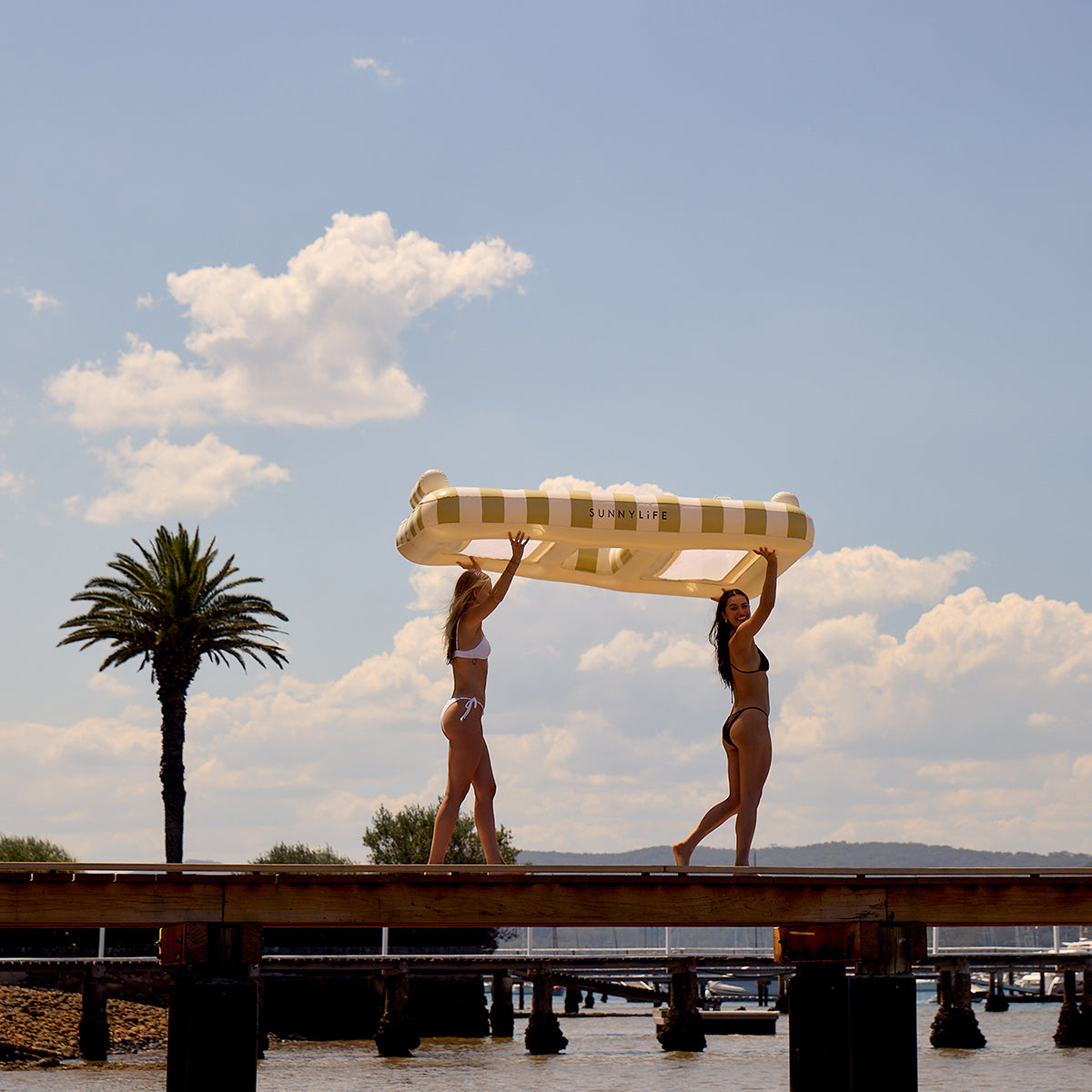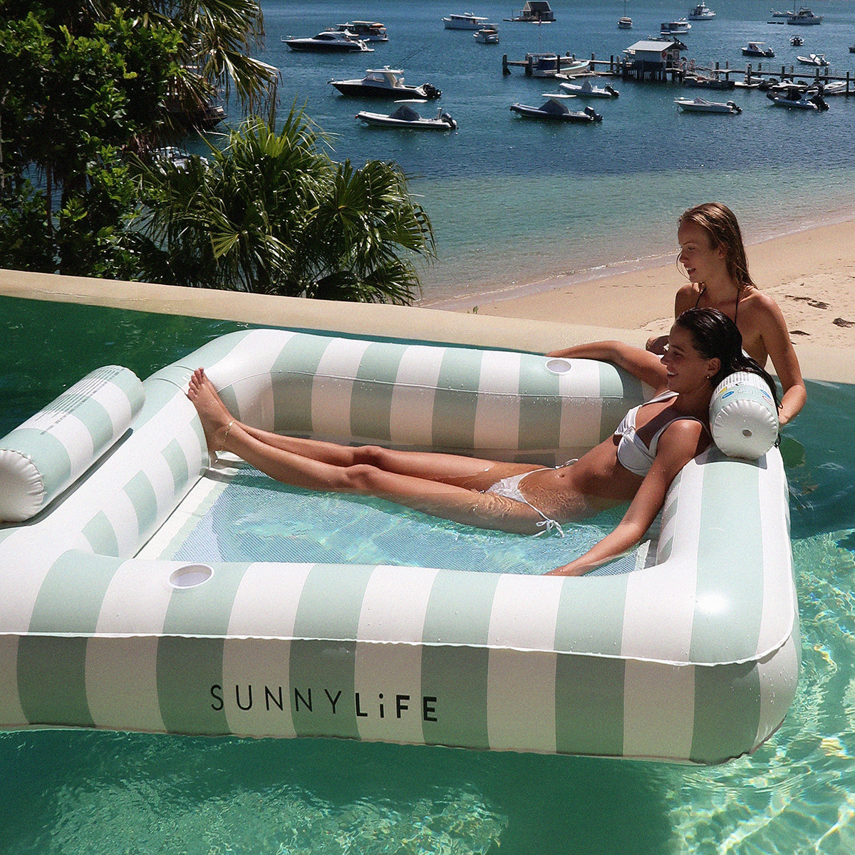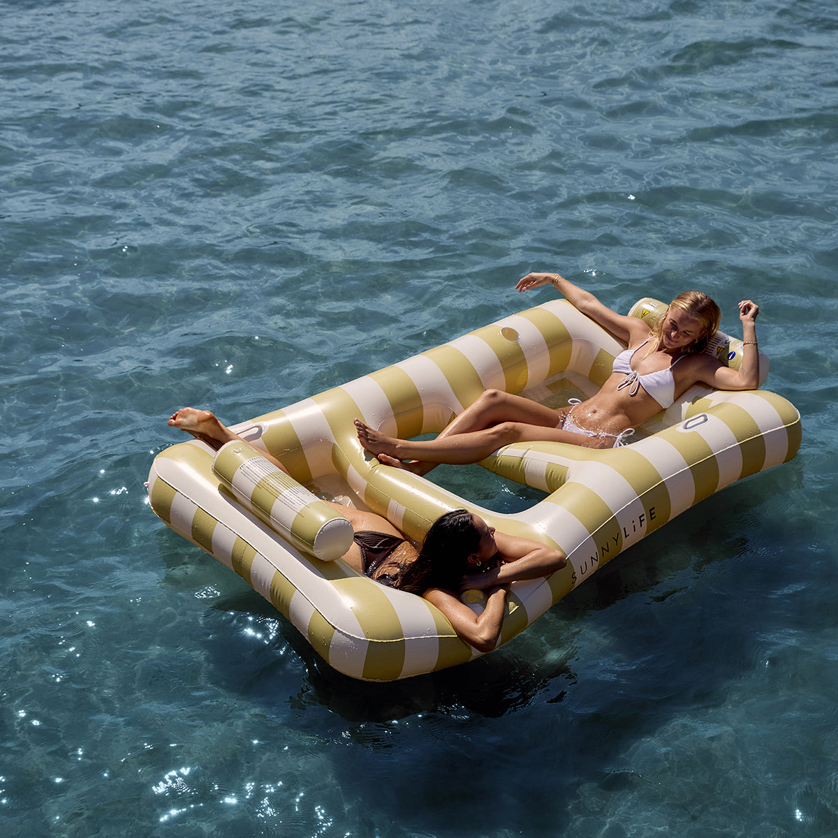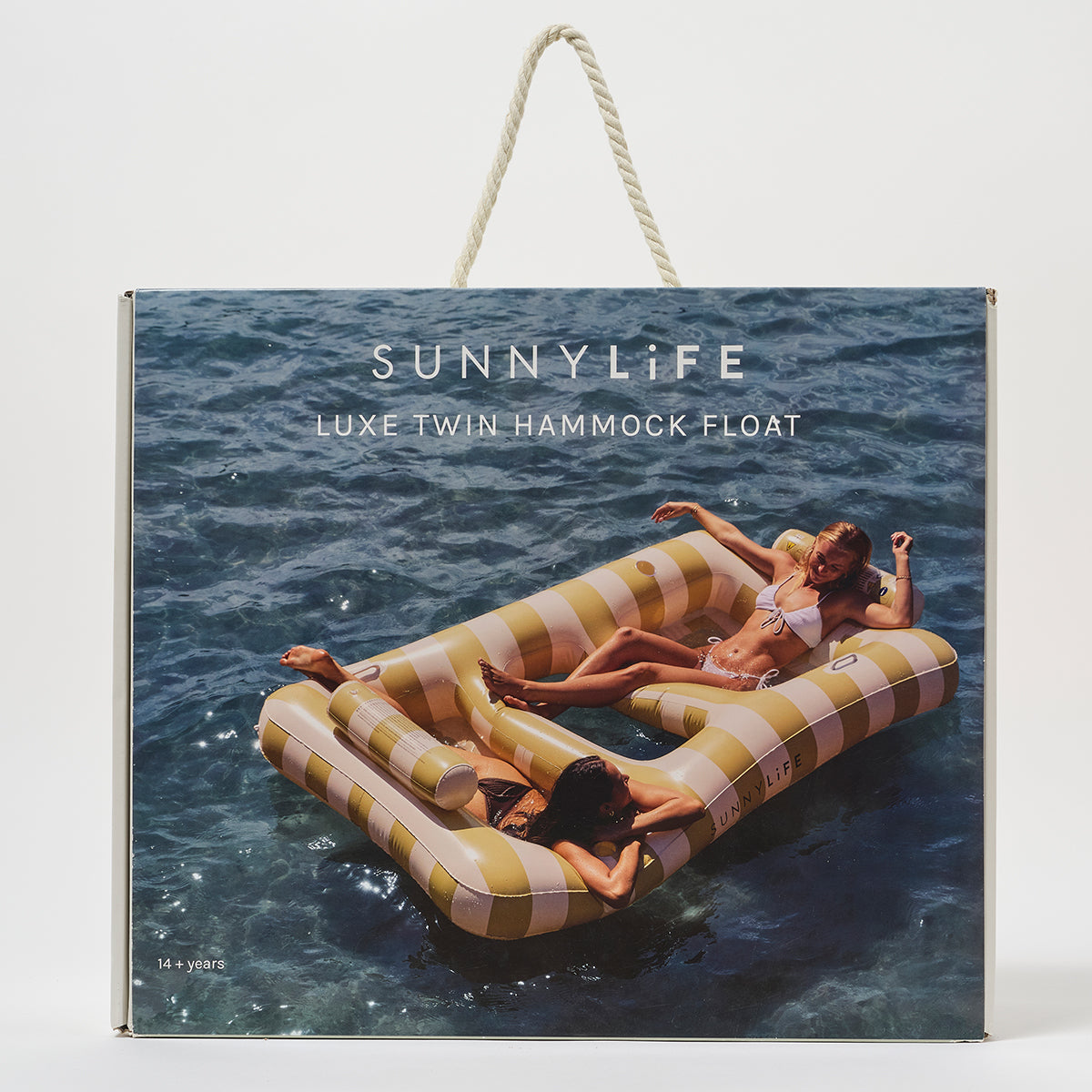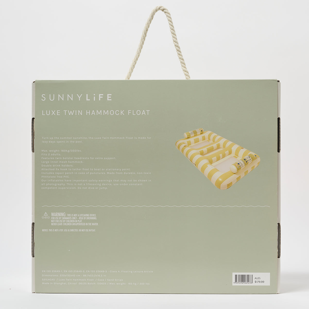 Experience the best of summer where luxury meets leisure. The Vacay Luxe Twin Hammock Float is stylish, oversized, and the CEO of relaxation, perfect for floating in the pool and long balmy days spent by the seaside. Designed to be enjoyed by two, featuring a mesh interior and an inflatable tube exterior so you can be partially dipped in the water. Take delight in the simple pleasures and have twice the fun with its warm olive and cream maxi stripe print that will have you and your bestie drifting into a daydream.