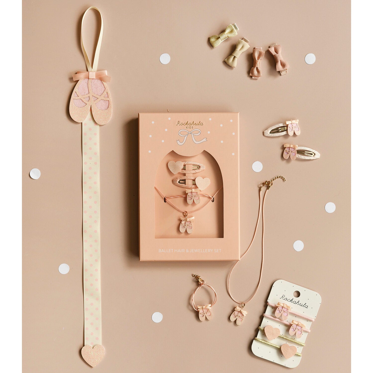The sweetest little ballet slippers in soft pink glitter adorn this set of four ponies. Featuring two satin hearts on gold elastics, and two glittery sets of ballet slippers detailed with pretty pink ribbon.