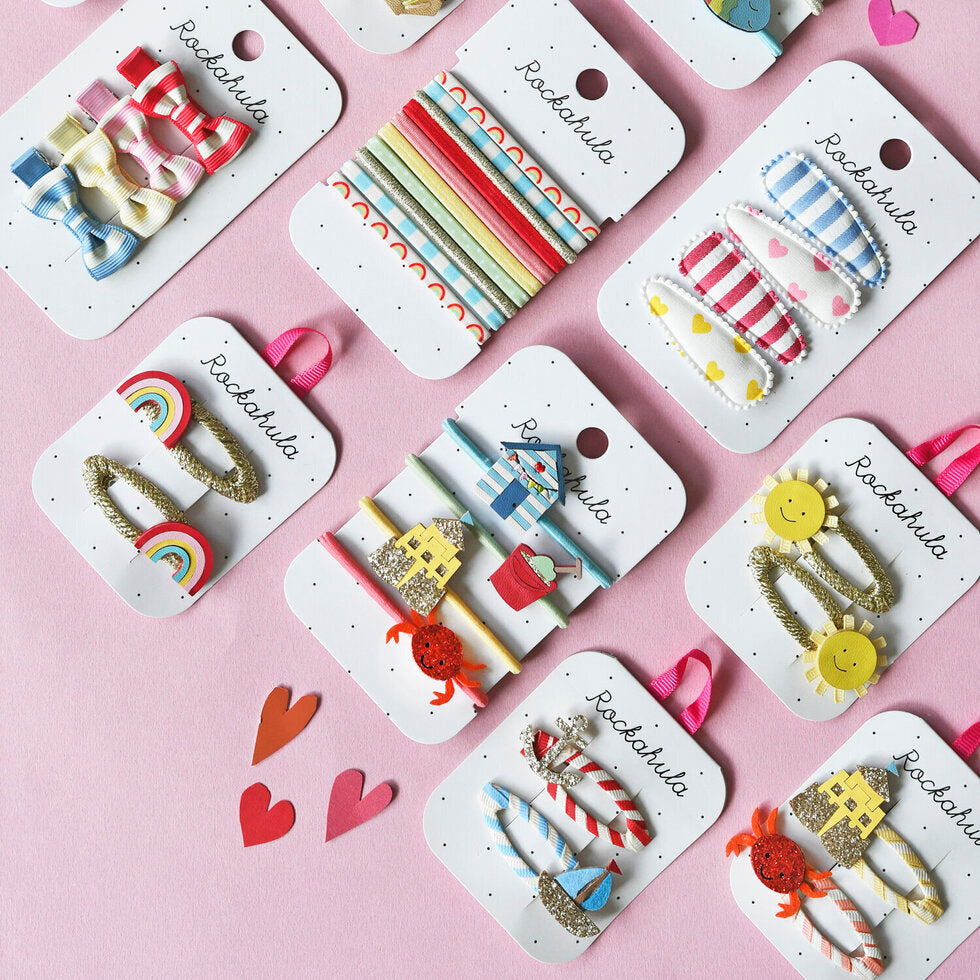 A pack of four sweet seaside scrunchies, each in a different beautiful fabric. Featuring our deckchair inspired striped blue and red, and a neutral base with pink and yellow love hearts.