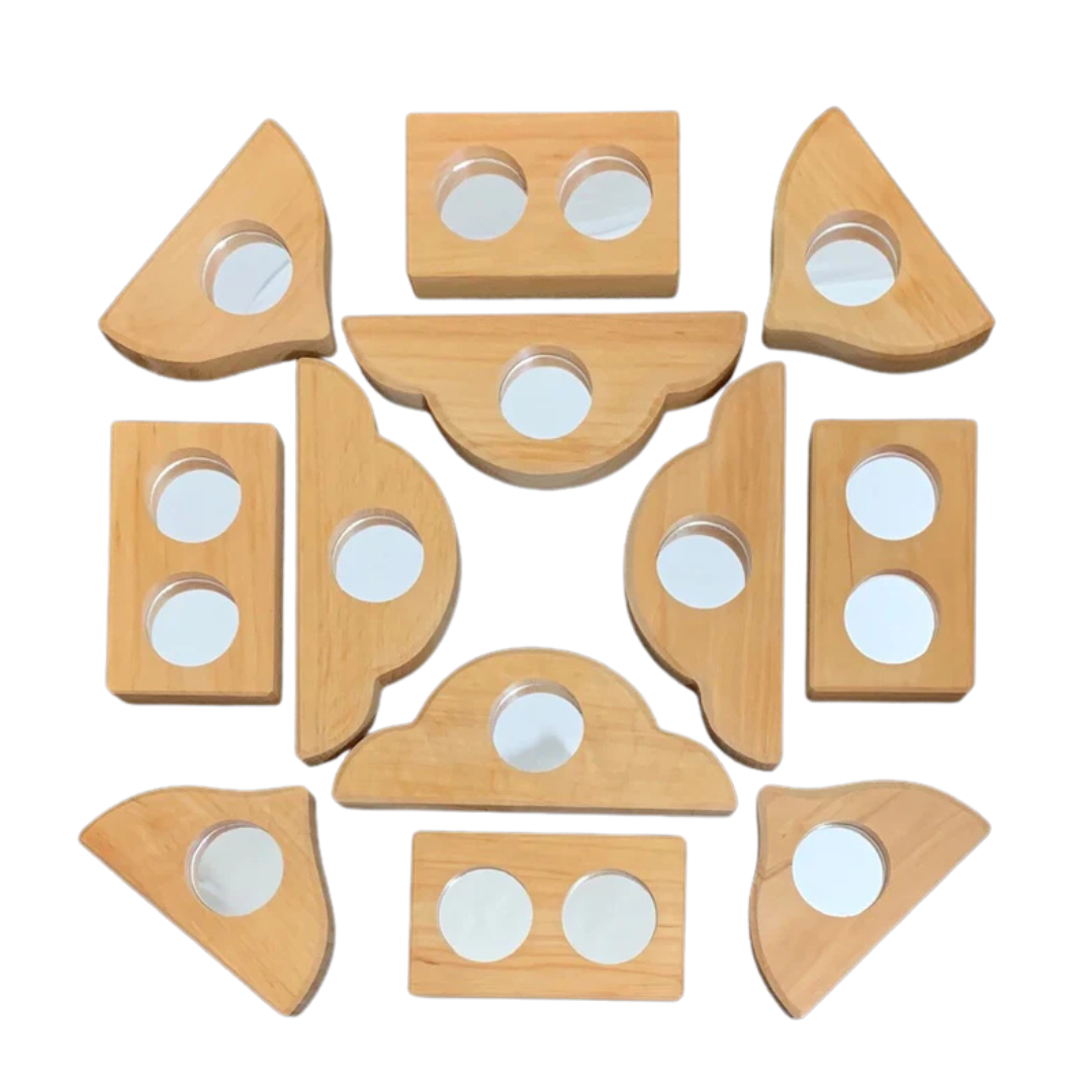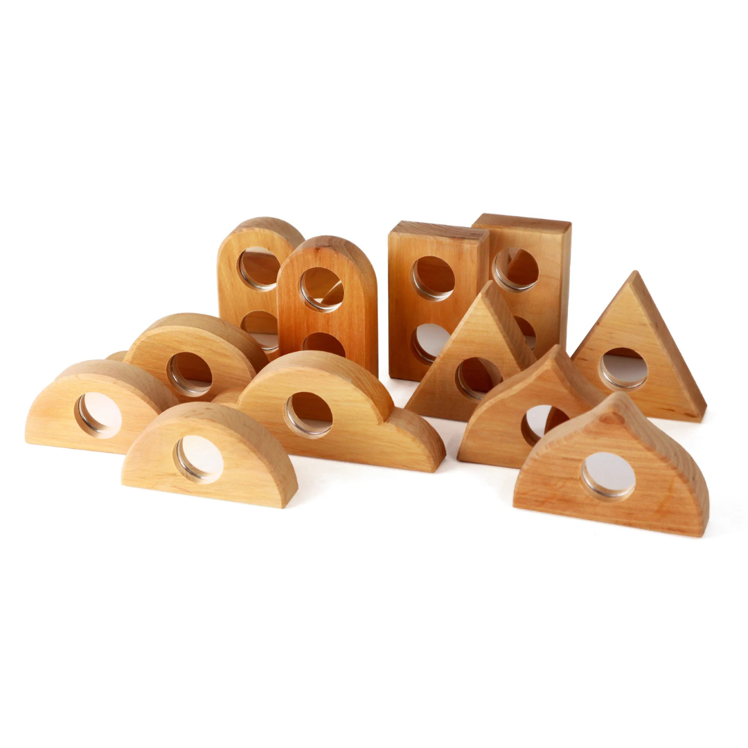 Playing with light and colour, these Bauspiel wooden Fairy Tale windows 12 parts are a natural wood block featuring a shimmering mirror window pane in each beautifully shaped piece.