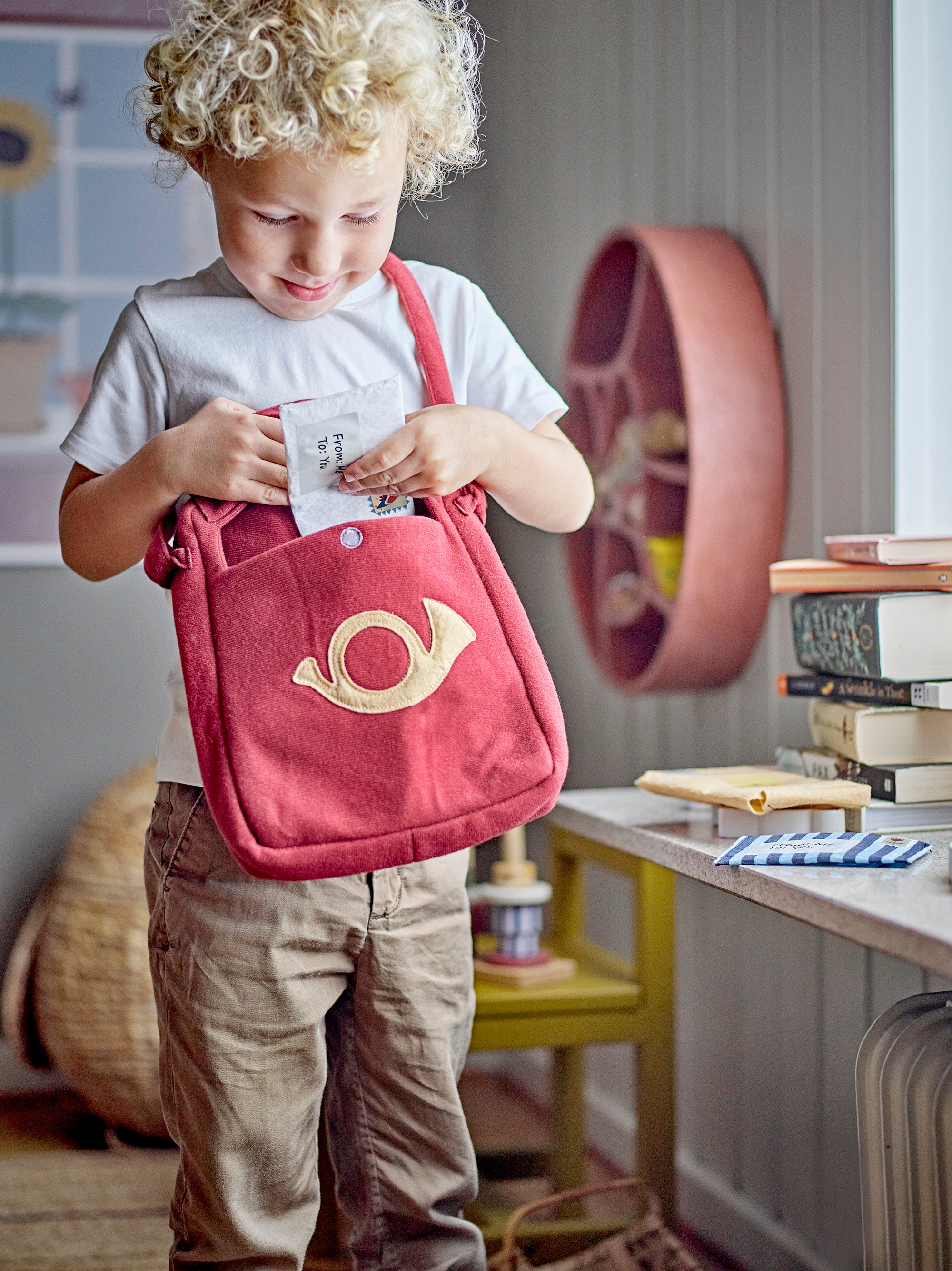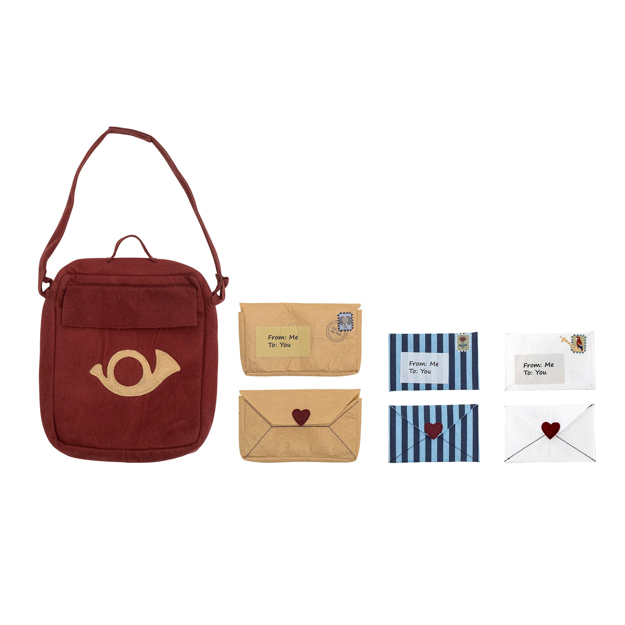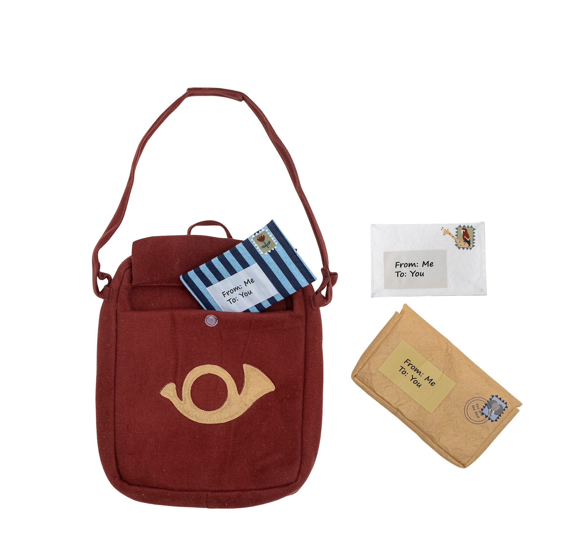The Louie Play Set by Bloomingville MINI allows your child to play as a mail carrier at home. The soft play set consists of a bag decorated with a post horn and several small letters. The small envelopes can be opened, so the child can place drawings or other gifts inside.