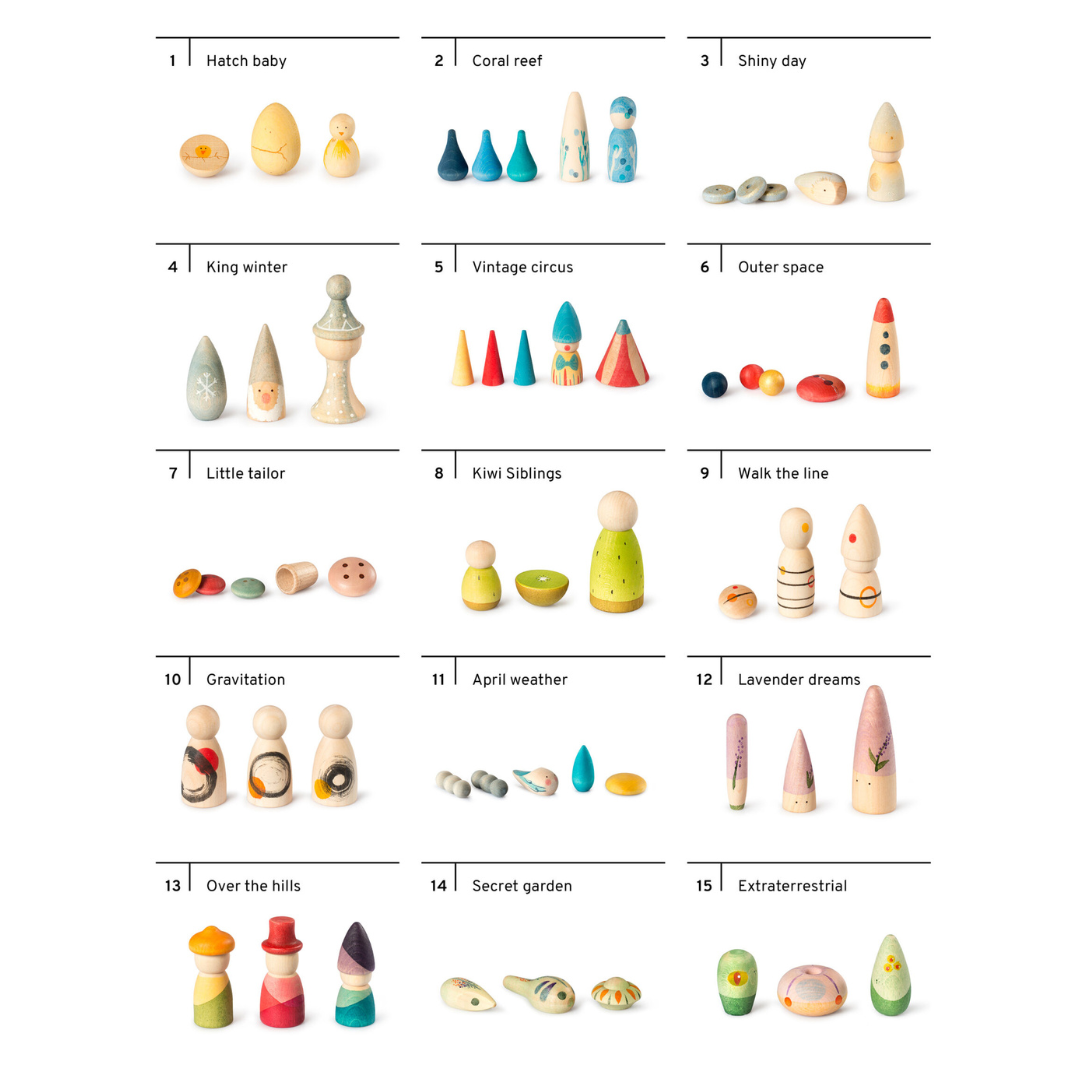 15 different boxes each with a little world inside. You can collect them all or you can spend hours of open-ended play with just one. Each box contains its own characters that can be extended with the figurines from the other boxes but do not have to. They work together but also by themselves. And the best part about it is the surprise. When you buy the box, it will be closed.