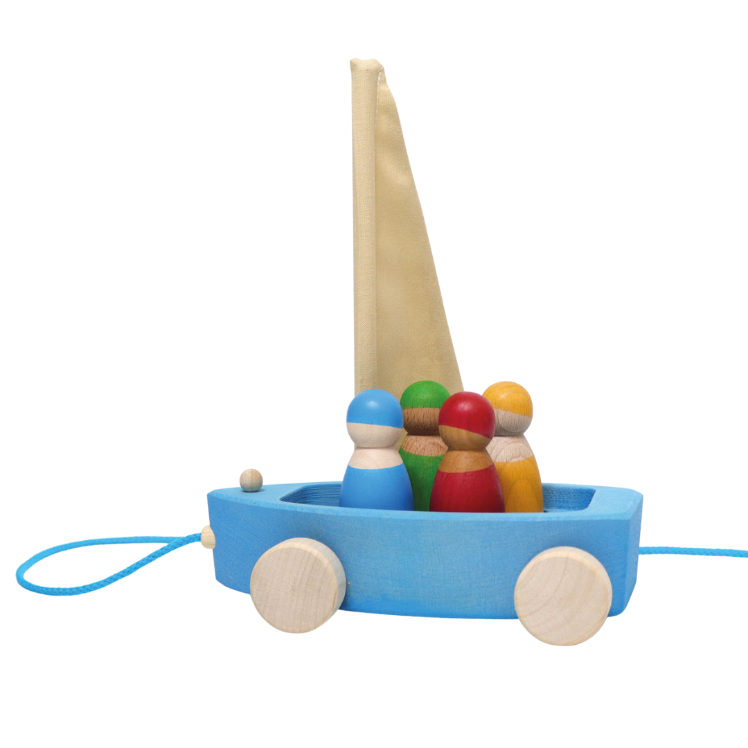 Wood: Three different types of wood from sustainable forestry, depending on availability (maple wood, beech wood, cherry wood or alder wood), non-toxic water based color stain/, boat from lime wood, non-toxic water based color stain