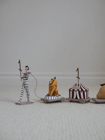 Pierrot walking with a lemon, a goose, a circus tent, a lion and a monkey