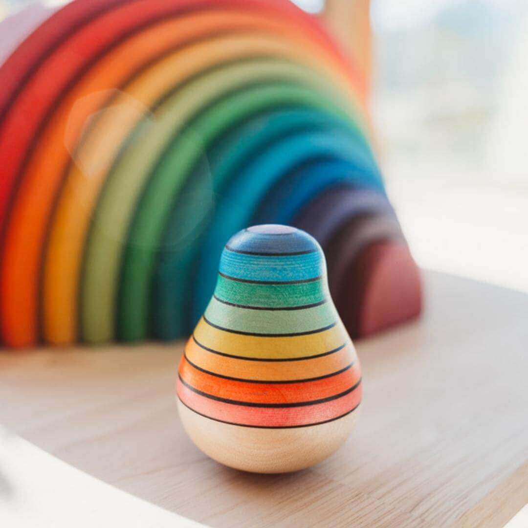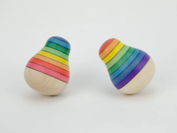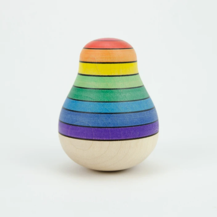 The Mader Roly Poly Rainbow Pear is a great gift for youngest. A classic pear shaped roly poly toy with brilliant rainbow colours. Your little one will have fun pushing this knock-over top in every direction and watch it stand straight back up, thanks to its clever weighted bottom. Its size makes it perfect for small hand to hold, shake and spin.