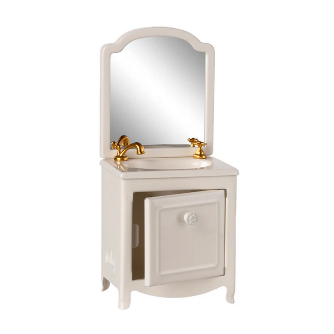 A toilet is added to the bathroom assortment. It is beautifully made in an off-white color with a black seat. Seat can open and close, and a pull function in the handle makes it very real and playful. It is perfect in size for the mouse family.