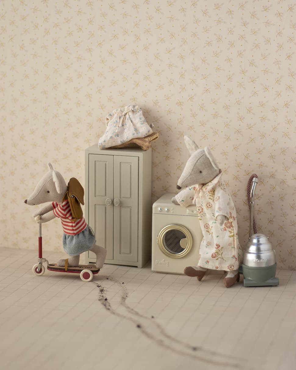 Every busy household needs a helping hand for the laundry - a washing machine is the right solution. It is made in metal and painted in off-white color, with many details that makes it indispensable in the play. Perfect in size for the mouse family.