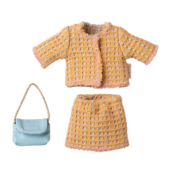 If you need a new set of clothes for your mouse this set will be a good choice. The suit is a short jacket and skirt. In the box you will find a real lady bag as well.