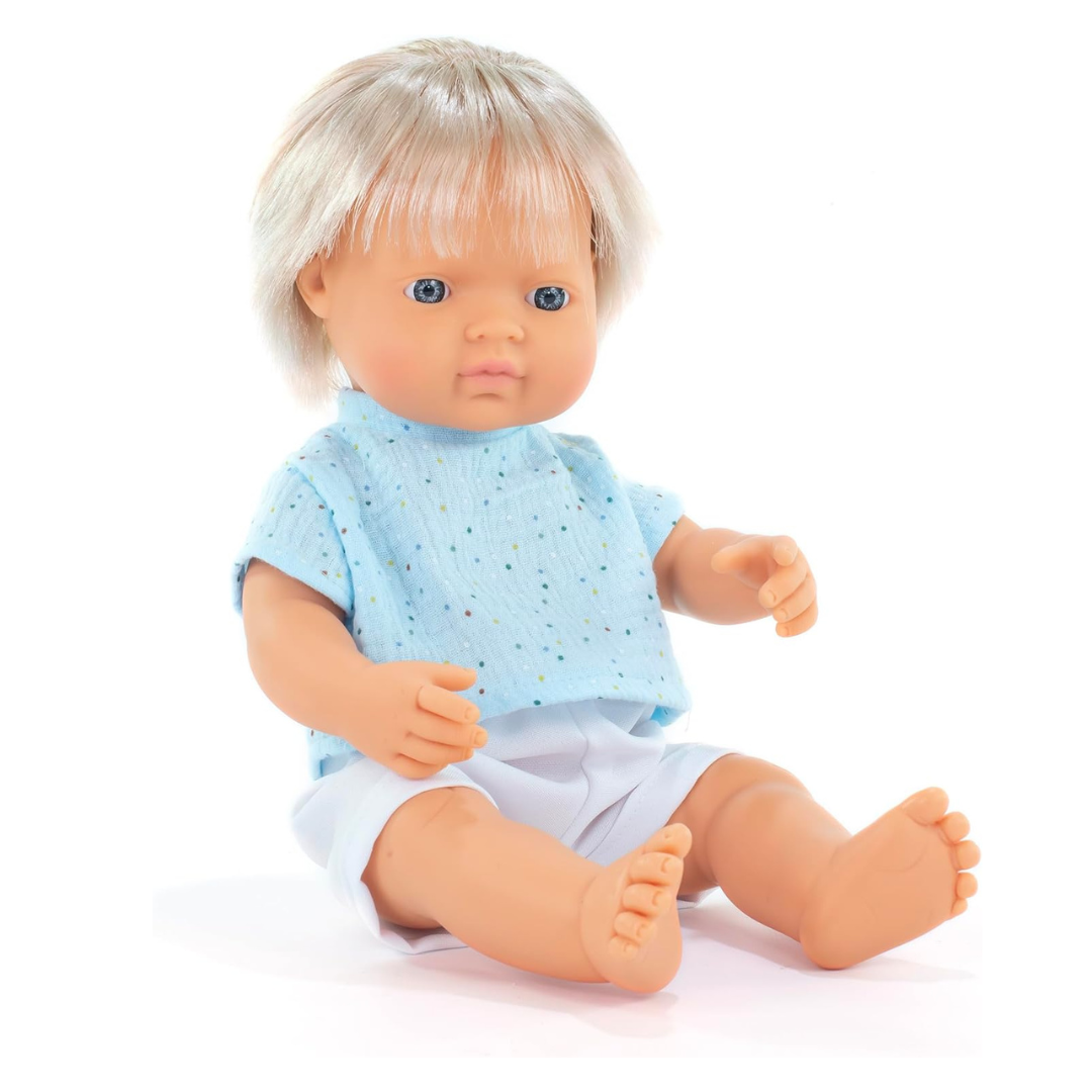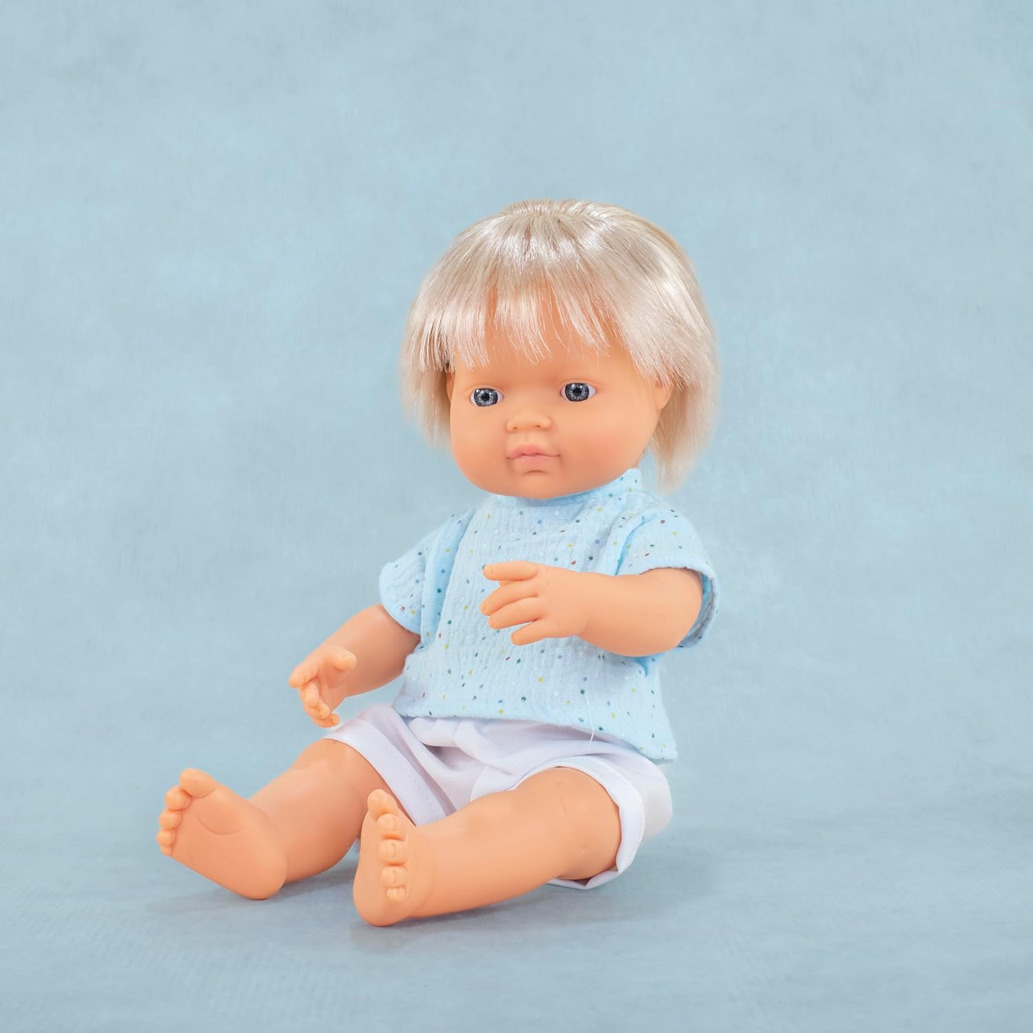 Miniland Baby Doll Caucasian BOY 38 cm BLONDE in Outfit
