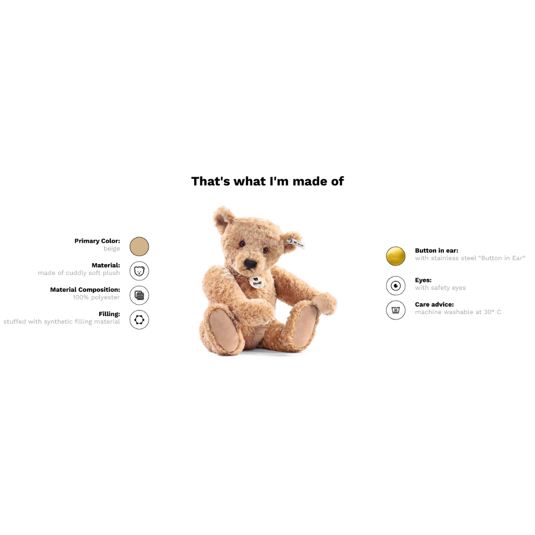 Steiff Teddies come in so many styles, sizes, and colors -- it's hard to choose just one! But we're especially fond of our Elmar Teddy, a traditonally designed bear with an updated, cuddly soft coat of durable synthetic polyester. Like all the finest Steiff Teddies, Elmar is five-way jointed. He's also softly stuffed to make him extra huggable. Elmar has shoe-button-style eyes and is entirely handmade in our very own workshops. He's machine washable and ultra-durable. From the company that invented the Teddy bear in 1902. With the world famous "Button in Ear" trademark, symbol of highest quality.