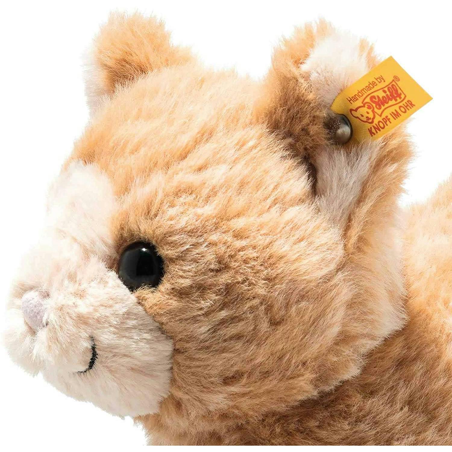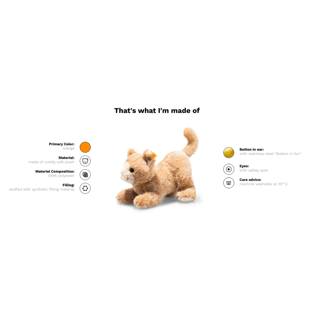 Measuring 26 cm tall, our strawberry blonde Cassie cat is stretching and getting ready to pounce. Her soft, cuddly plush coat is thick, short and a little tousled, and her pale plush snout and ears come with airbrushed details. She has inquisitive little eyes, a pink nose, pale paws and a happy, upright tail. Every single Cassie cat is a greeting from the Steiff factory. Thanks to the little bean bags in all four paws, this little cat is able to remain steady as she prepares to pounce... Cassie cat is the perfect companion for any child who loves to play with fun, independent cats. “Jump, Cassie!”