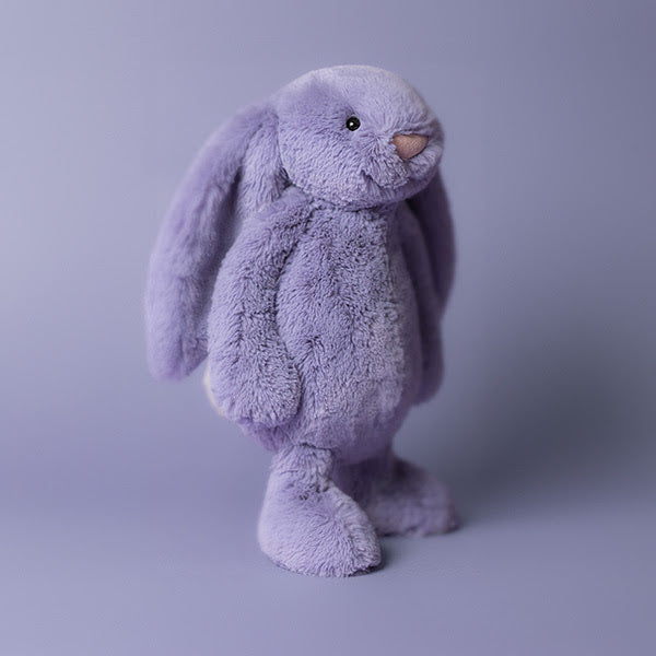 Bashful Viola Bunny is gorgeously soft in pastel violet fur. This purple bunny has long floppy ears, huggable paws and a pink suedette nose. With a cuddly tummy and soft cream bobtail, Viola's a soothing blossom.