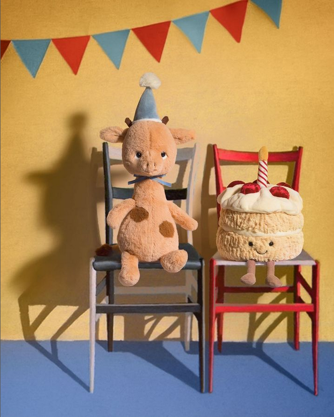 Amuseable Birthday Cake is snuggly-scrumptious, with tussly fur so beautifully baked. This party poppet wears a squashy hat of heavenly splodgy buttercream, topped with velvety strawberries and a striped jersey candle. Kick up those cordy boots and let's celebrate!