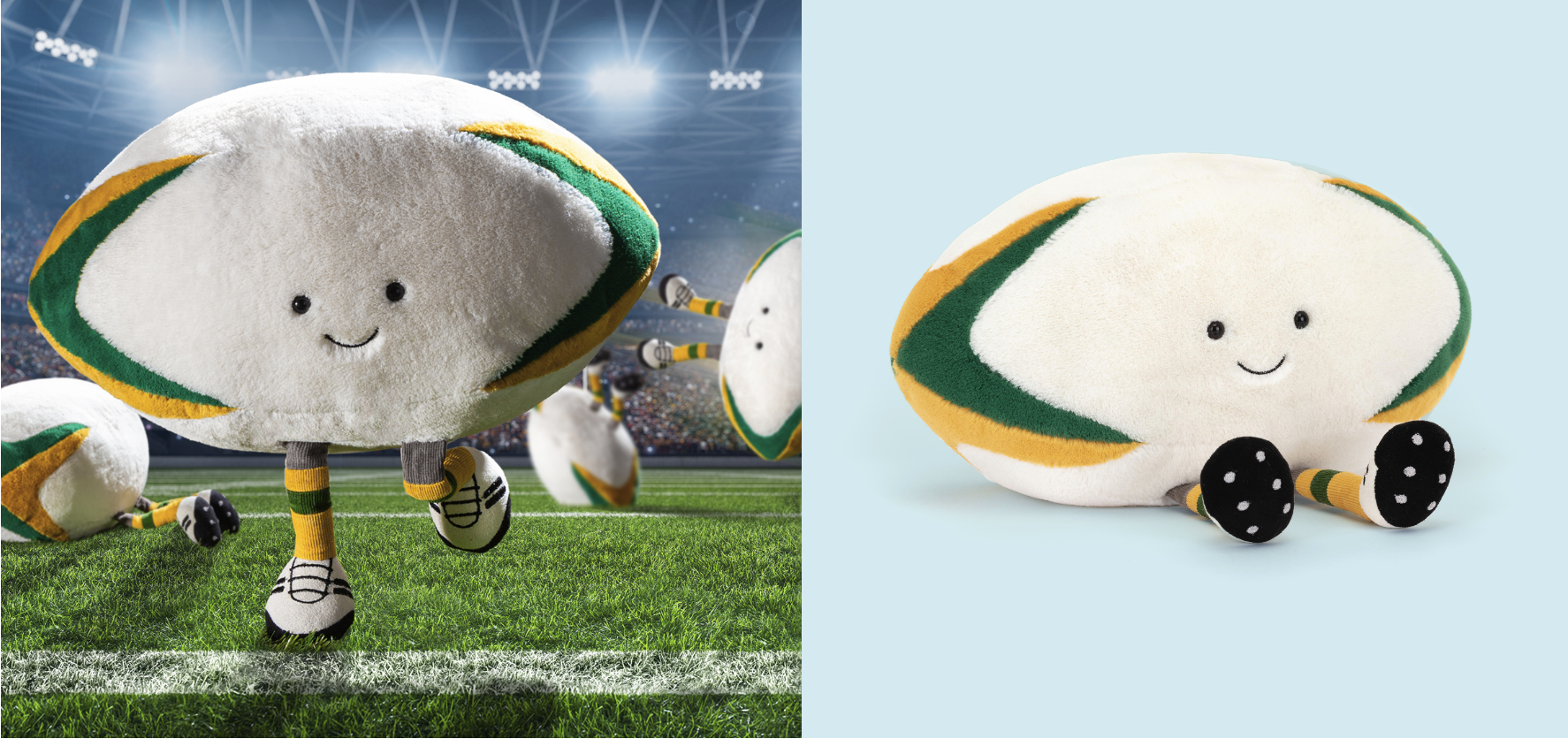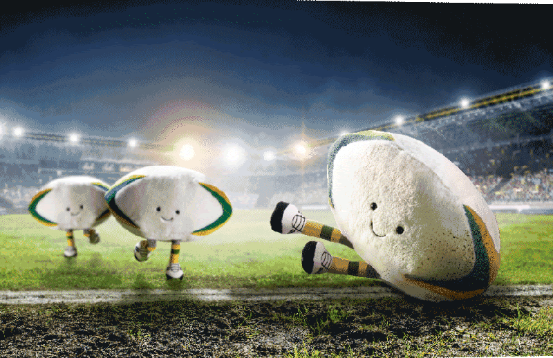 Sleek and streamlined in a smooth cream fur and navy blue detail, Amuseable Sports Rugby Ball is too refined for a muddy playing field. With red and white striped fine cord socks and suedette black and white boots with lace and stud embroidery detail, drop goals have never been so stylish!