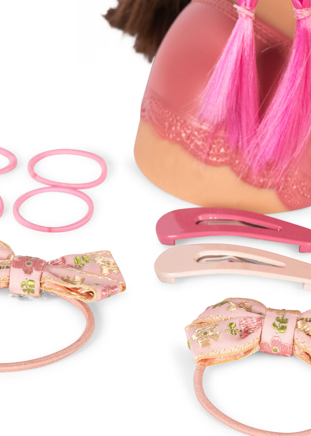 Includes: - Stella the doll. - 1 crystal hand mirror. - 1 brush. - 1 bow. - 1 scrunchy. - 4 hair clips. - 1 mini hair clip. - 4 elastics. - 4 micro star hair clips. - 1 headband. - Hair beads. - Glitter hair extensions. - Color hair extensions.