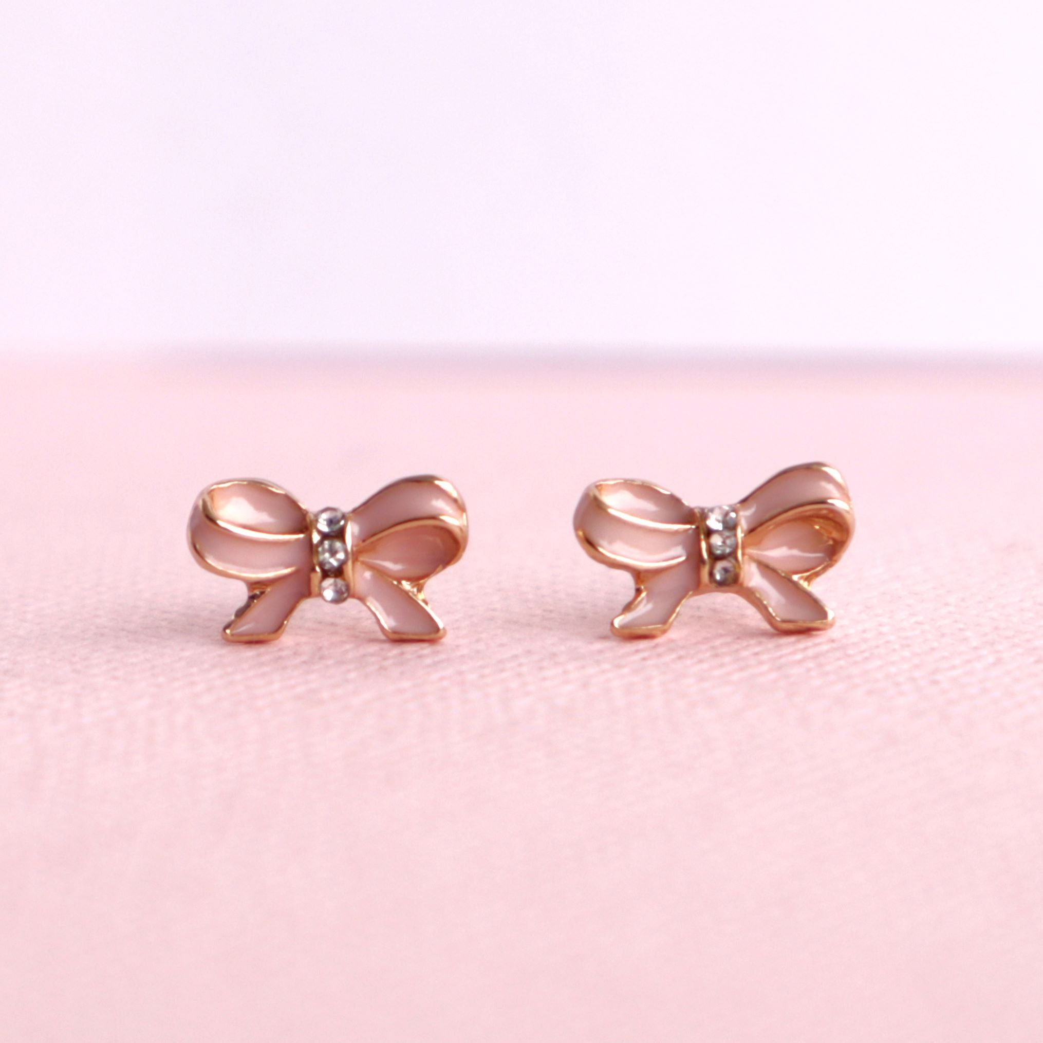 Petite, elegant, and sweet, our Pink Bow Earrings make a wonderful gift for a special occasion. Encrusted along the bow knot with shining diamantes, the pink bows also feature gold accents to give the earrings a simple, but luxurious look. Presented in wonderful Ballerina Ring Box, something a little girl is sure to treasure as much as their new earrings.