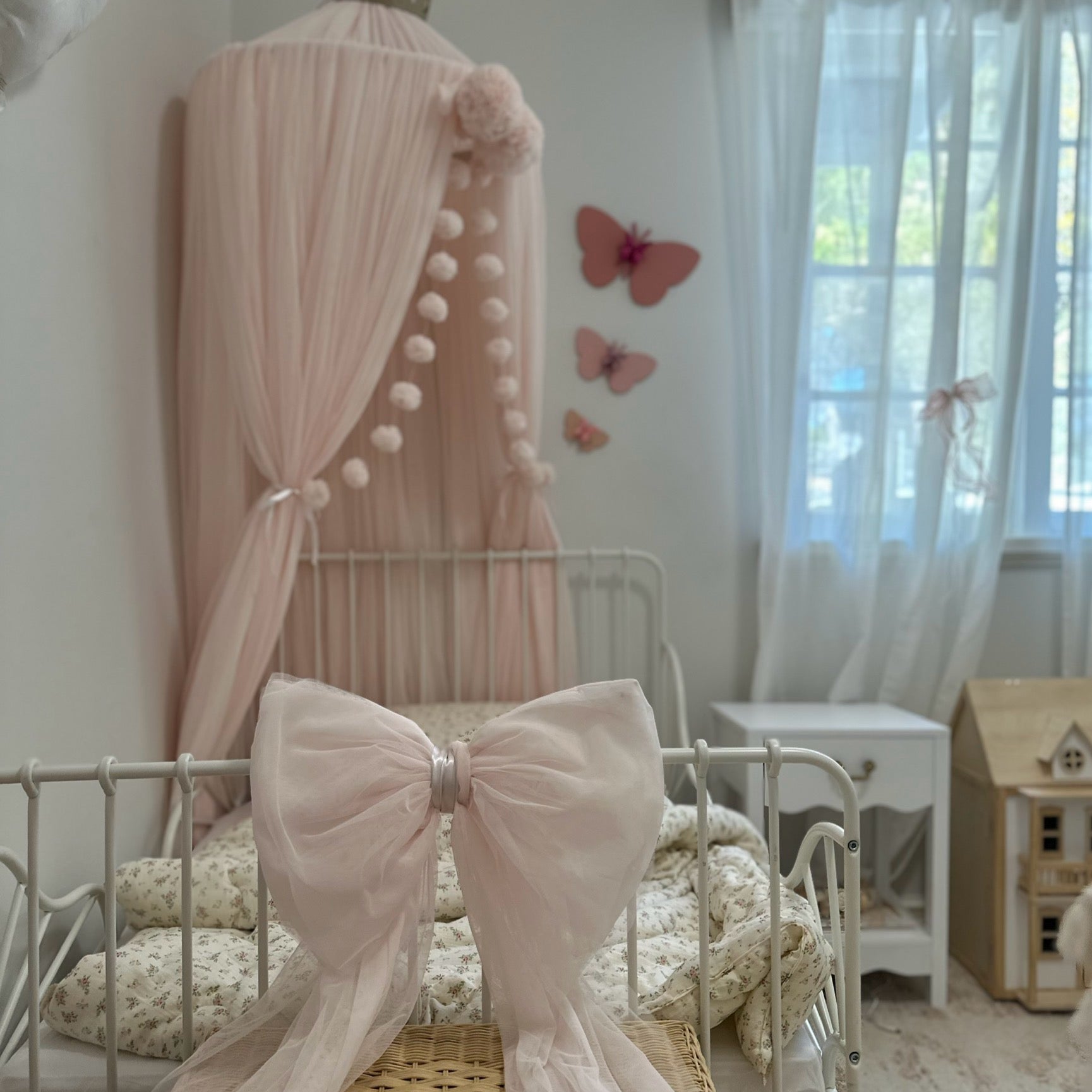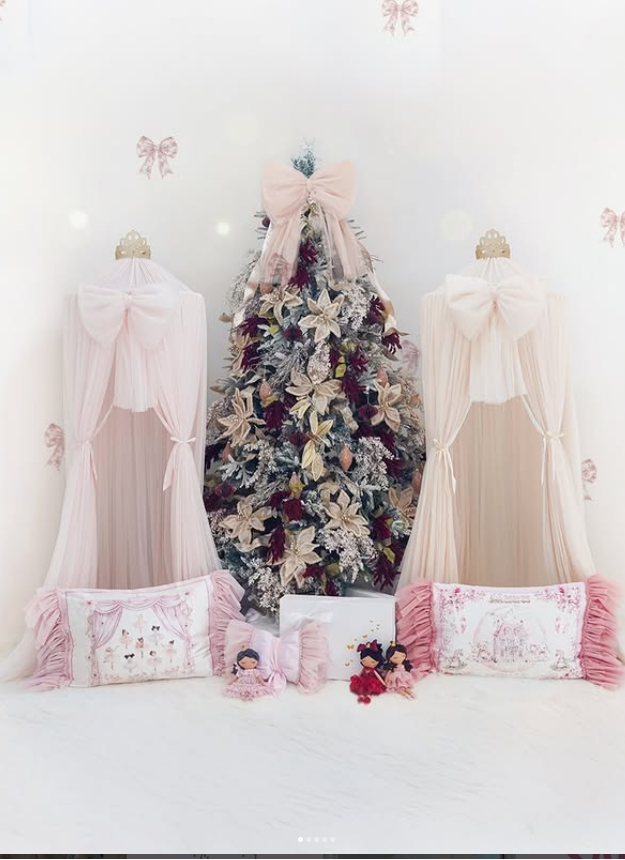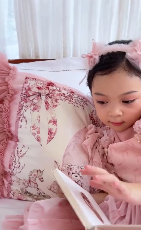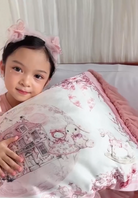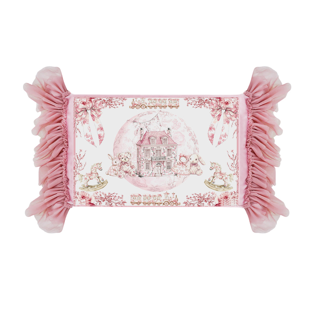 Our Toile Princess Pillowcase features a beautiful artwork of floral toile showcasing dreamy vintage toys, framed with delicate flowers, bows, and soft pink borders. It is adorned with fluffy ruffles made of our premium Soft Tulle and American Tulle on both sides, adding a touch of fairytale charm. Ribbon ties on one edge secure the pillow cushion in place, completing this timeless piece made for her sweetest royal dreams.