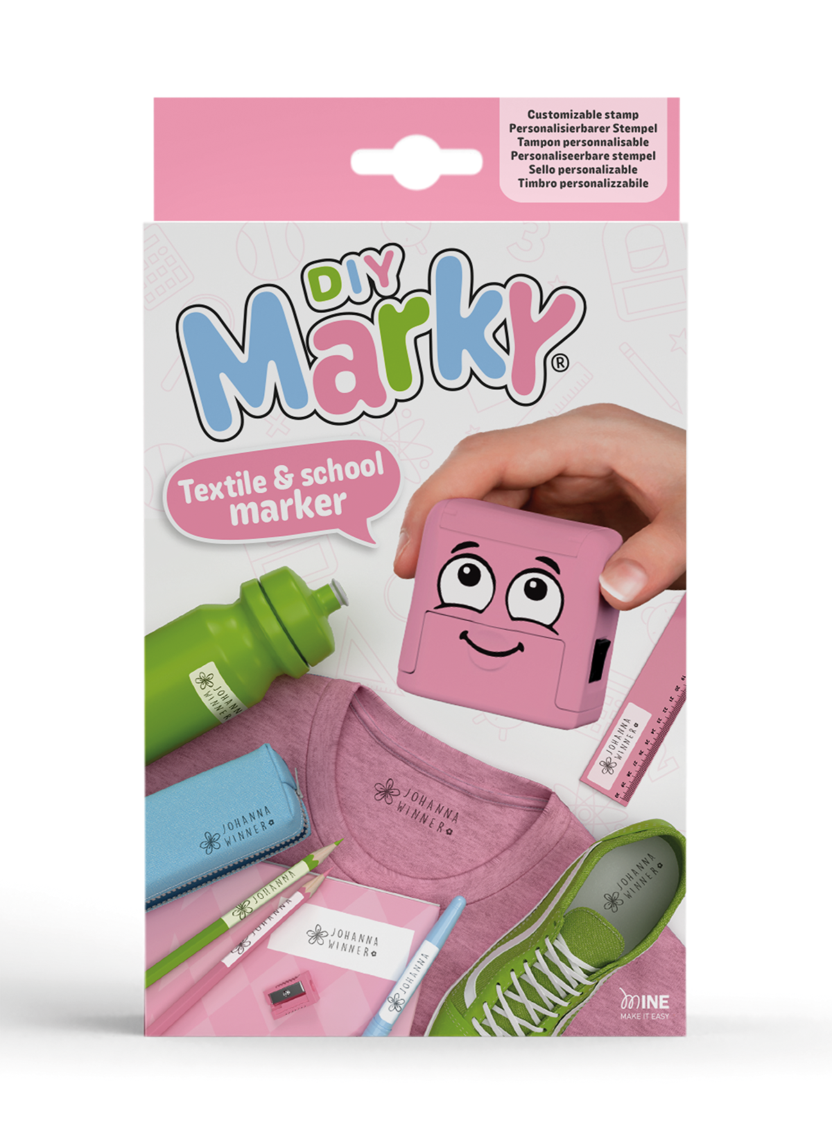 The DIY Marky set is a complete labelling system, combining smart design with high-quality European manufacturing. Each set includes a personalised stamp with a built-in black textile ink pad, capable of approximately 1,000 impressions on textiles and other absorbent surfaces. In addition, the kit includes iron-on tape for dark fabrics and dishwasher-safe labels for non-absorbent surfaces such as drink bottles and lunch boxes, allowing parents to label virtually anything their child takes out of the house.