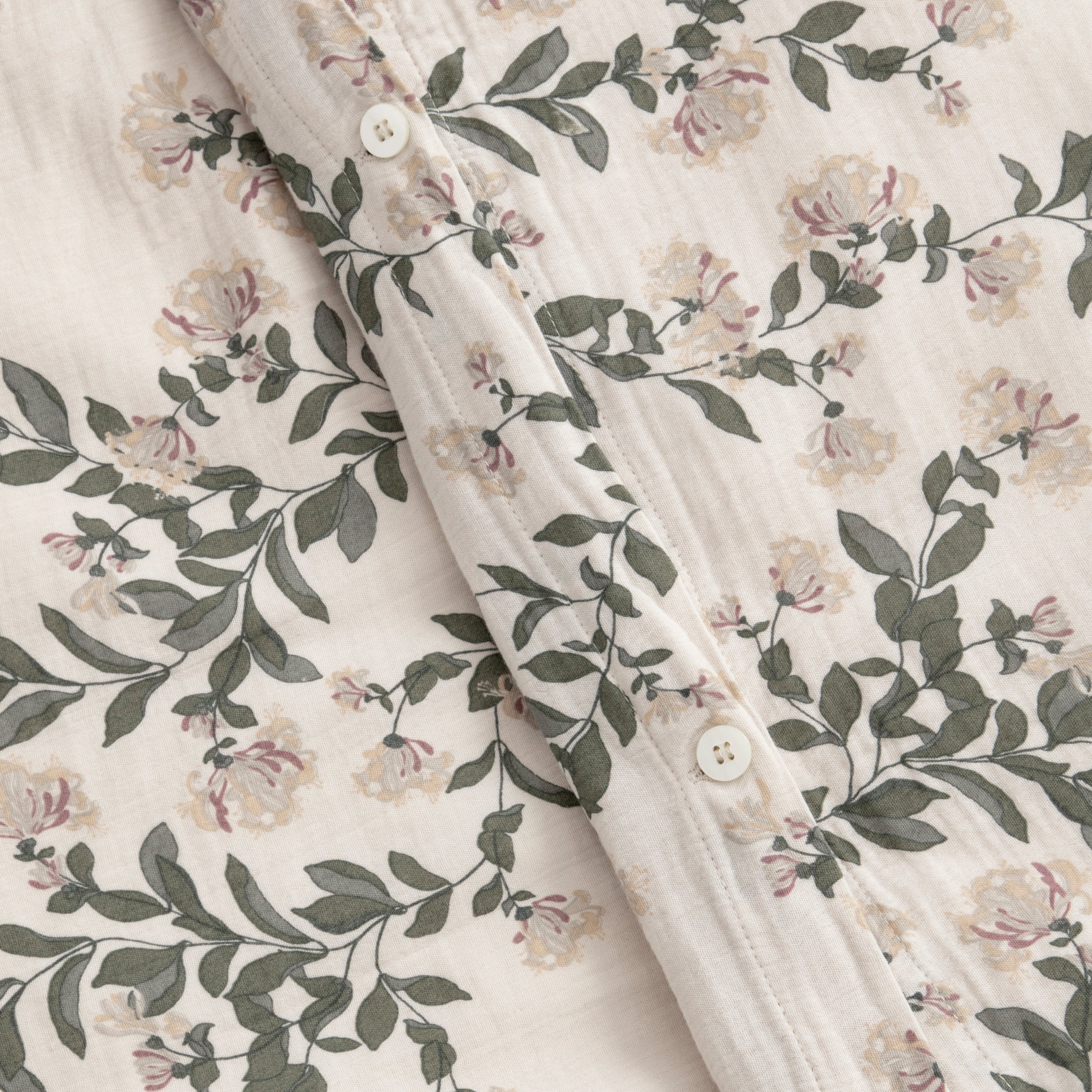 Honeysuckle is the most fragrant and beautiful of vines, with its clusters of colourful florals that almost looks like they are smiling in the warm sunshine, it has a definite home in the Garbo floral line. Our Honeysuckle pattern is set on a light sandy background and features two tones of green climbing vines along with florals in yellow, gray and muted purple.