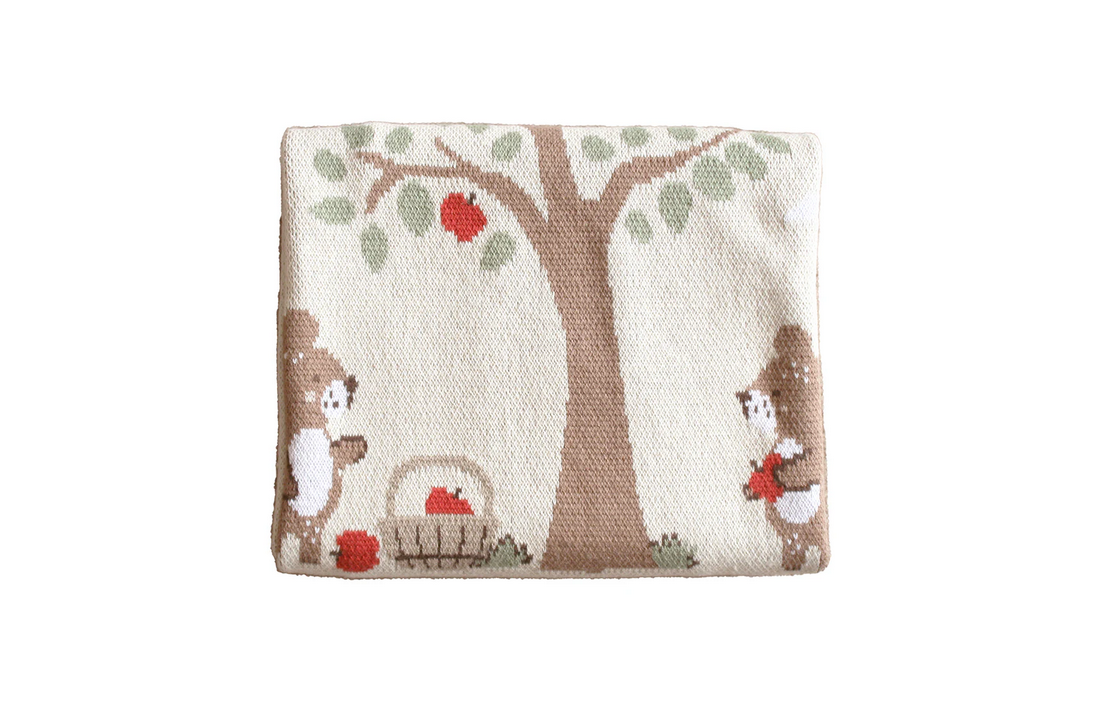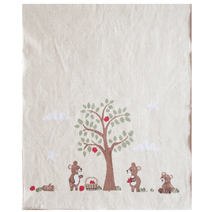 A unique and gorgeous lightweight 100% cotton knit natural baby blanket featuring teddy bears picnic. Adorable!