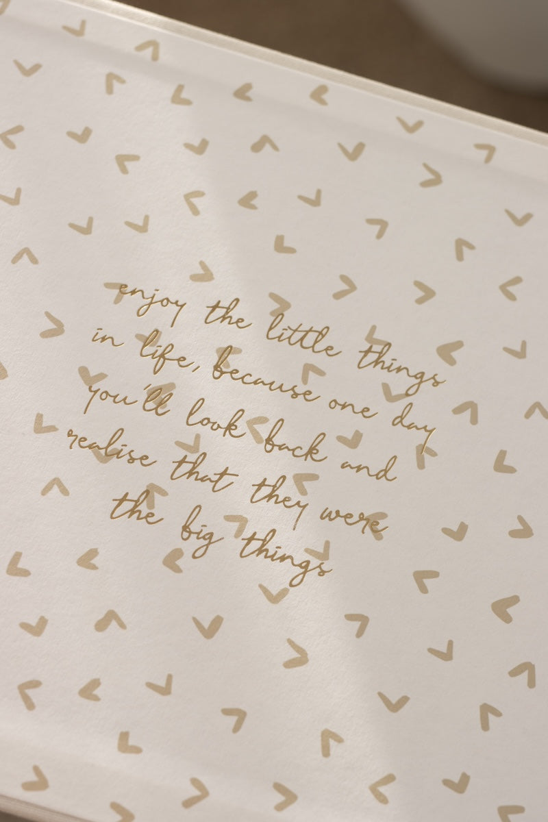 - Complementary colour inner with gold foil quote embossed: 'enjoy the little things in life, because one day you’ll look back and realise they were the big things’
