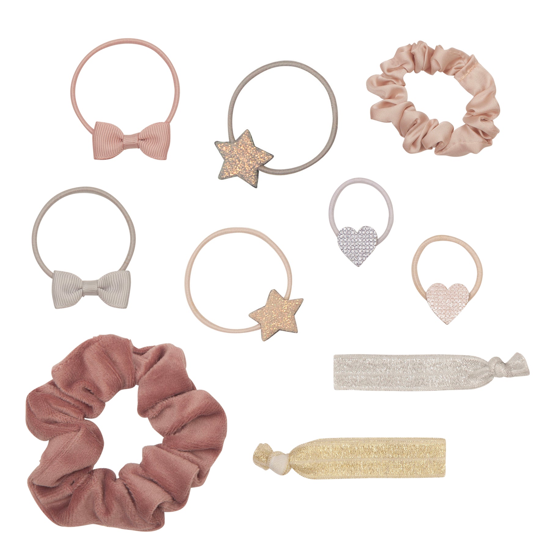 Gifting just became even more magical with this beautiful new tulle pouch! Untie the satin ribbon to reveal a beautiful assortment of hair bands and scrunchies. A mix of styles in a perfectly pretty palette of pinks, metallics and greys, ideal for every day styling!