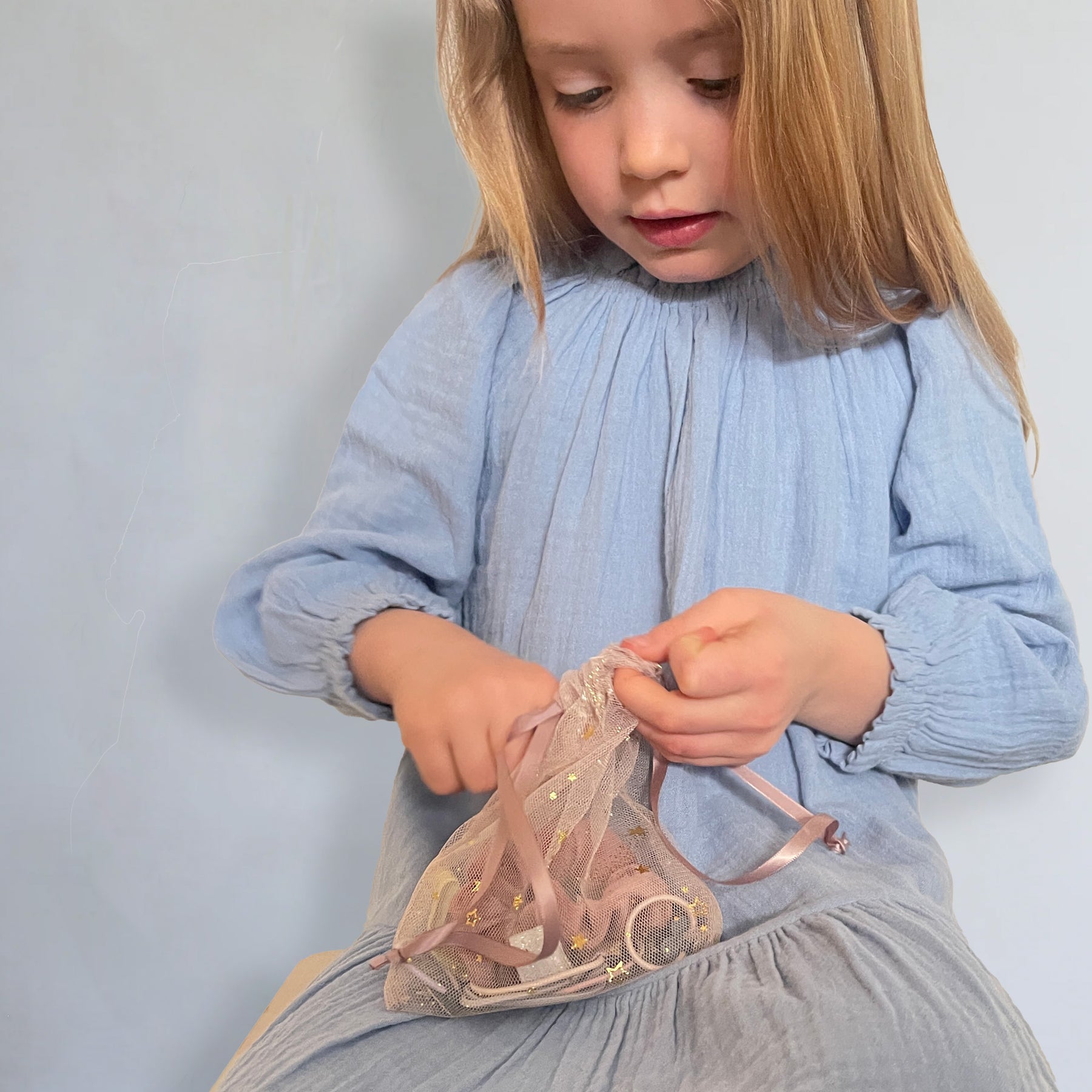 - Pouch crafted from layers of soft tulle, star speckled fabric with soft pink satin ribbon tie
