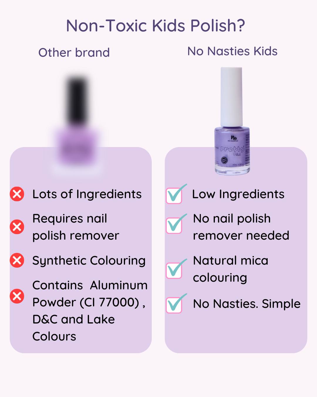 - Non-Toxic: By eliminating harmful chemicals commonly found in traditional nail polish, No Nasties Kids 20 FREE non-toxic alternative gives peace of mind for parents.