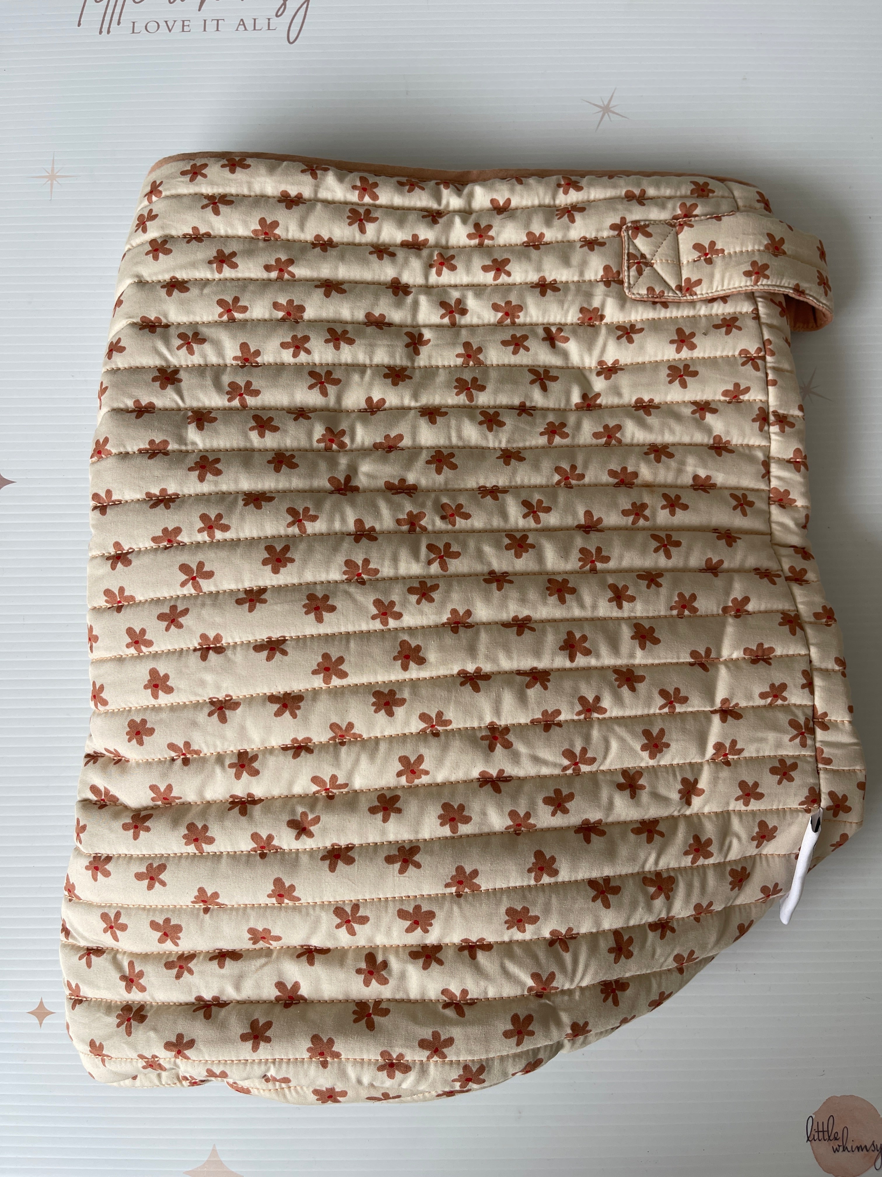 Beautiful Liewood storage in pink, with flowers in shades of pink all over, with a quilted look with horizontal stitching.
